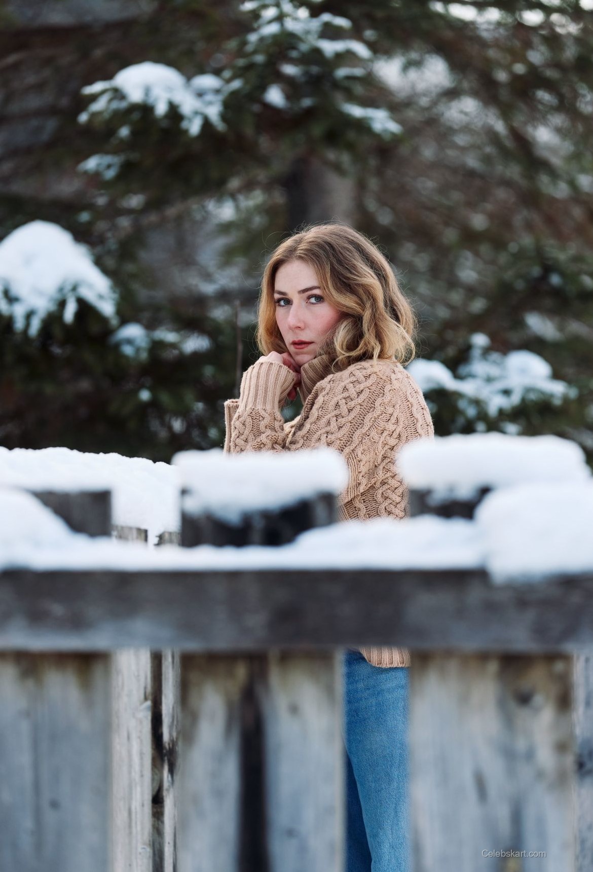 The picturesque setting matched Mikaela’s captivating look remarkably. As she posed near a wooden fence amidst a snowy landscape, the natural light accentuated her features. Her soft waves fell gracefully around her face while she gently tucked a loose strand behind her ear. This simple gesture added a touch of candidness to the shoot, making her relatable and approachable.