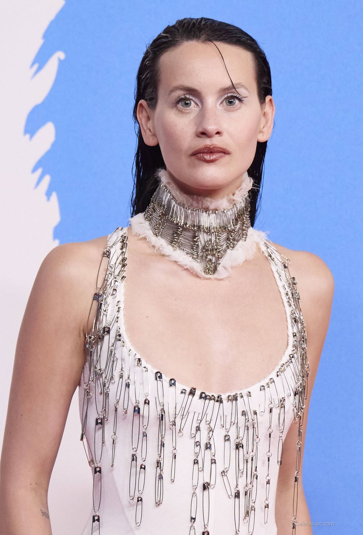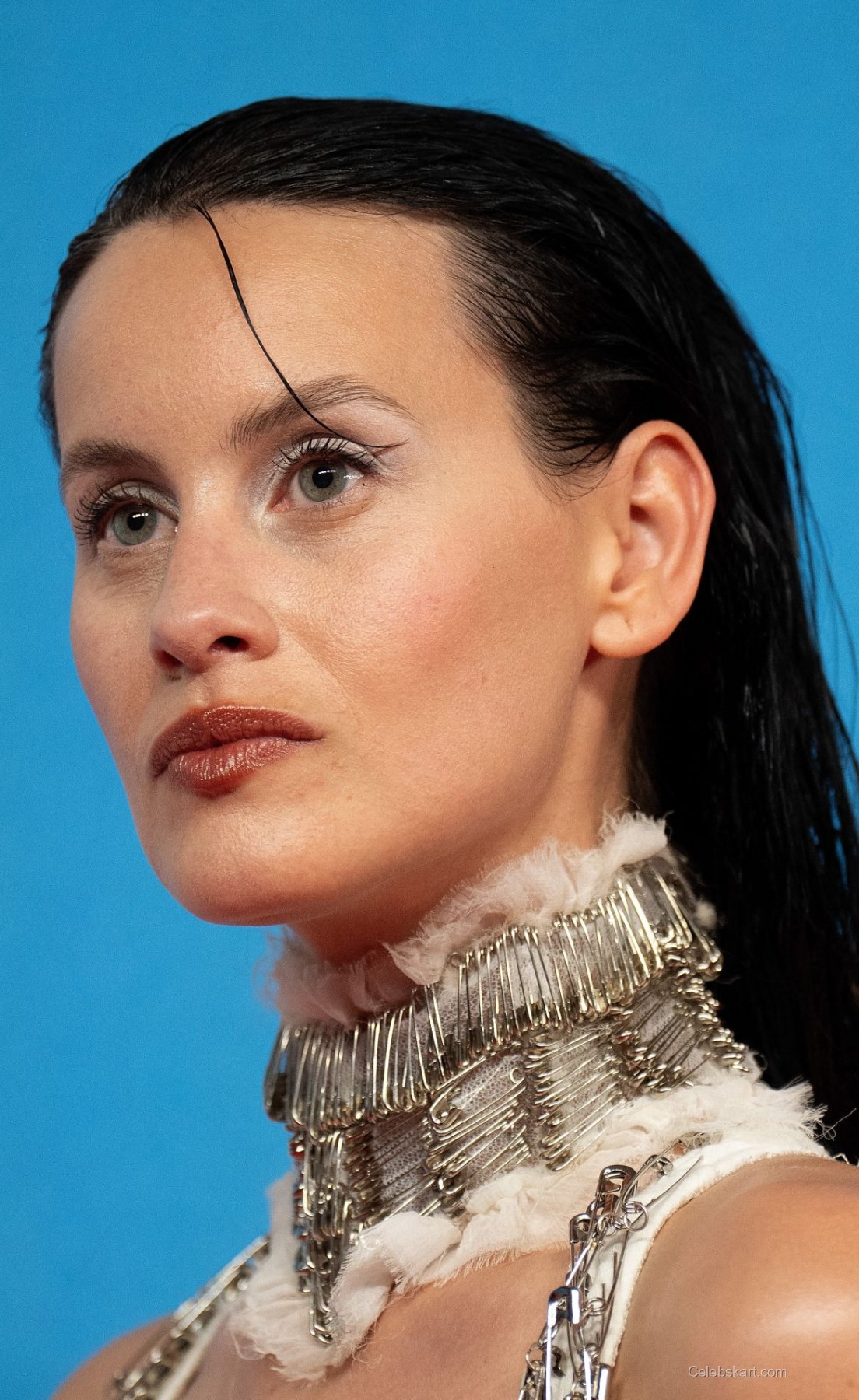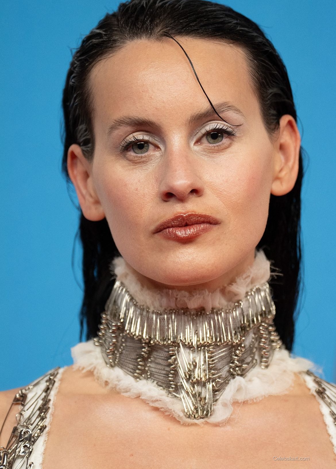 Milena's choice of a striking white dress emphasized her fashion-forward approach. The dress featured intricate silver details, notably a series of delicate chains and embellishments that cascaded down, creating a visually captivating effect. This look was enhanced by the bold statement of the unique choker, which framed her neck beautifully, seamlessly blending with the overall ensemble. The soft sheen of her dress, combined with the sharp metallic accents, made for a refreshing contrast that drew the crowd’s attention.