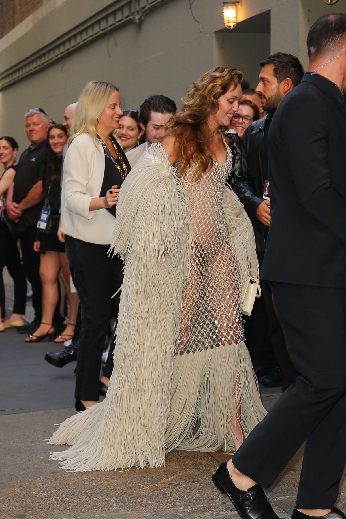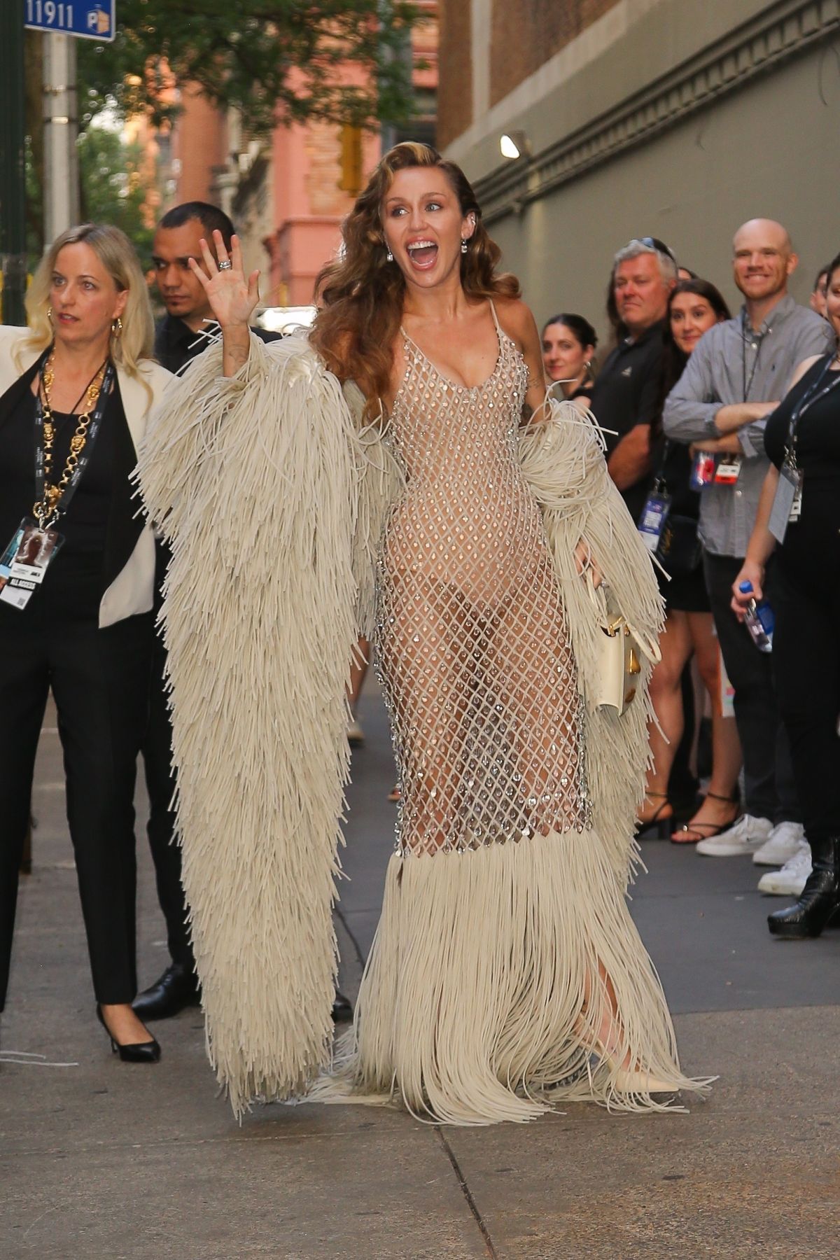 Miley Cyrus in Glamorous Fringed Mesh Gown Look
