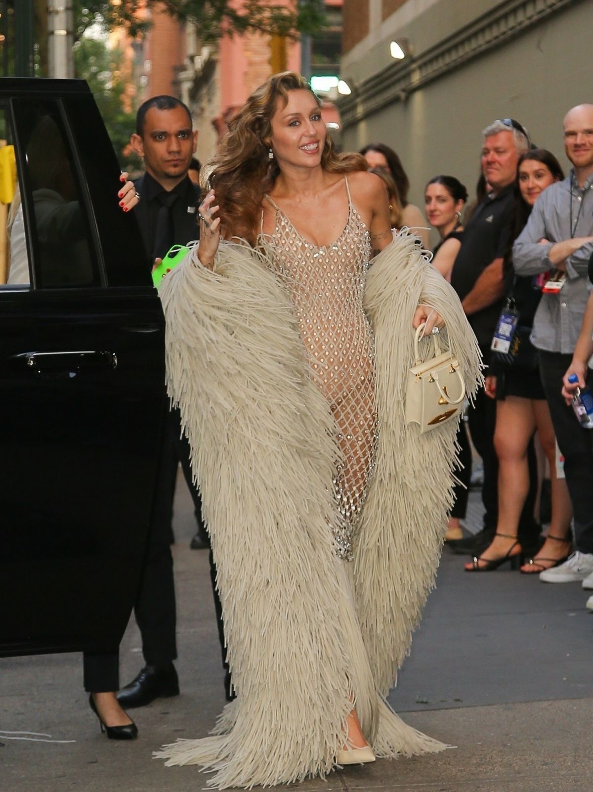 Miley Cyrus stepped out in a nude, sheer mesh gown adorned with sparkling diamond patterns and bold floor-length fringe accents. The look was elevated with a dramatic cream-colored fringe cape that added texture and volume. Her choice of soft wavy hairstyle and radiant makeup completed the glamorous ensemble, giving a perfect mix of boho-chic and red carpet elegance. Miley accessorized with a minimalist white handbag and subtle drop earrings, letting the statement outfit shine.