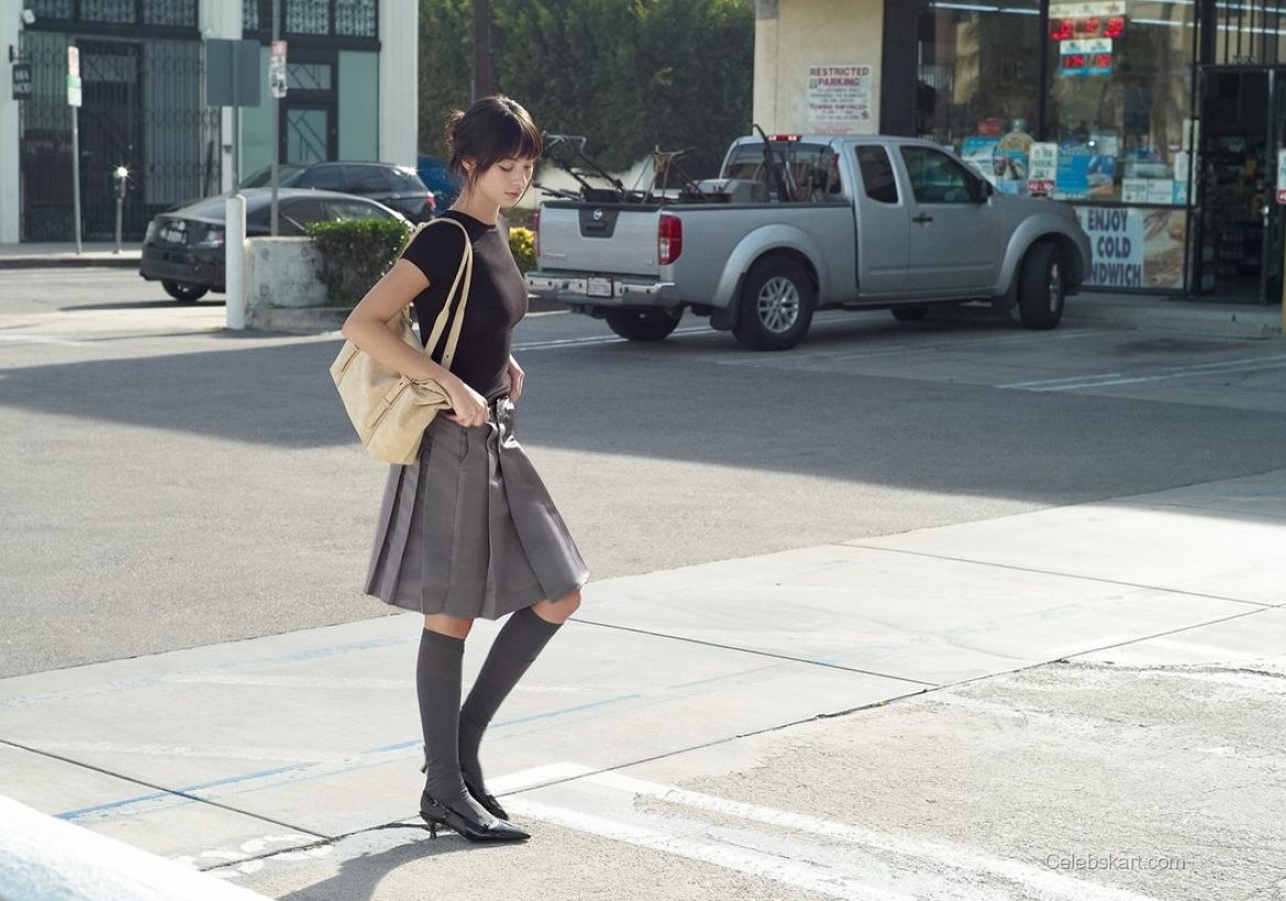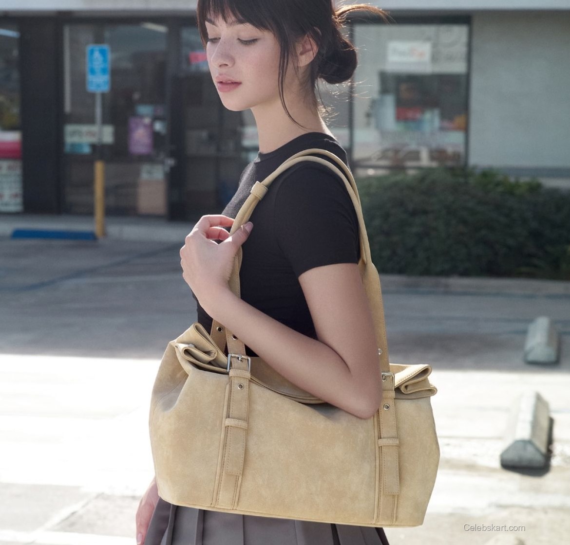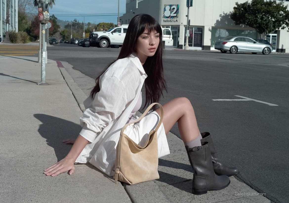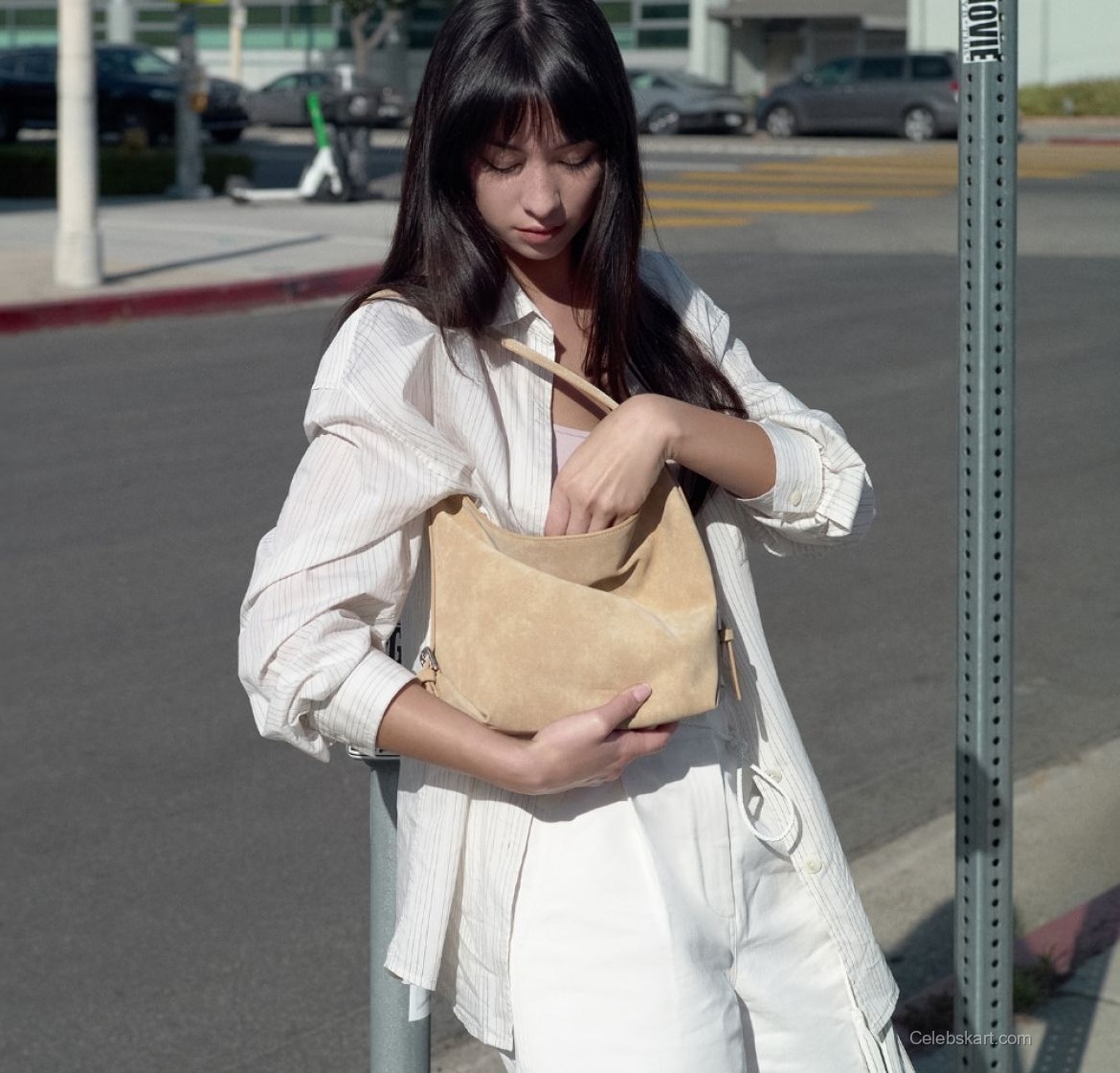 As Mishka poses, she interacts with her stylish handbag, which further complements her outfit. The subtle beige hue of the bag adds to her overall aesthetic while giving the look an interesting textural contrast. In one moment, she is slightly tilting her head, showing her delicate facial features against the backdrop of a vibrant urban setting. Another capturing shot has her adjusting her bag, a casual yet intentional action that enhances her approachable aura.