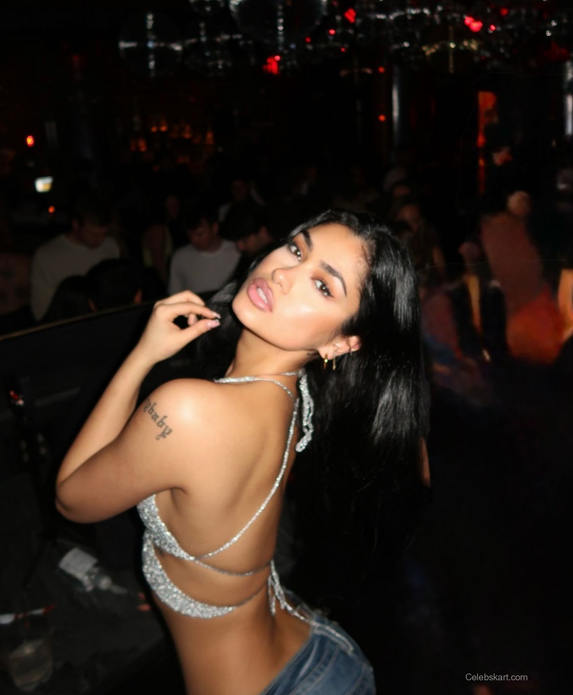 Her striking ensemble featured a silver crop top adorned with glimmering details, perfectly complementing her casual blue jeans. The top's design showcased various intricate patterns and cutouts that emphasized her silhouette. The combination of the shimmering fabric and denim created a harmonious blend of glam and classic style.