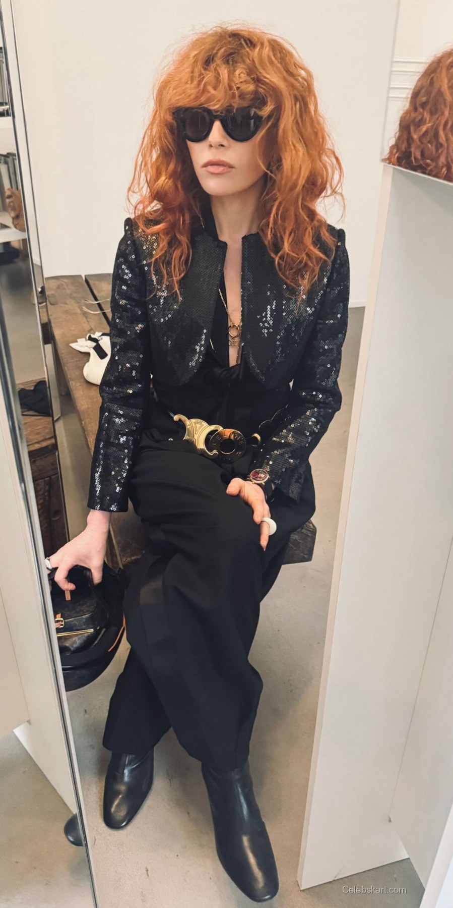 Her outfit featured a stunning black sequined jacket paired with high-waisted trousers. The sleek cut of the trousers emphasized her silhouette beautifully, while the playful sequins added a touch of sparkle to her overall look. A distinctive gold belt cinched her waist, providing a stylish contrast to her dark clothing. To enhance this sophisticated look, Natasha opted for black ankle boots, seamlessly tying her outfit together.