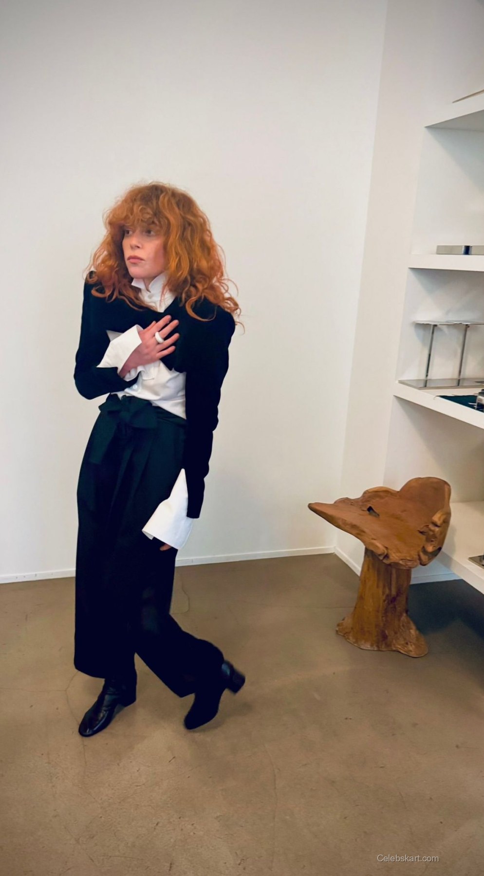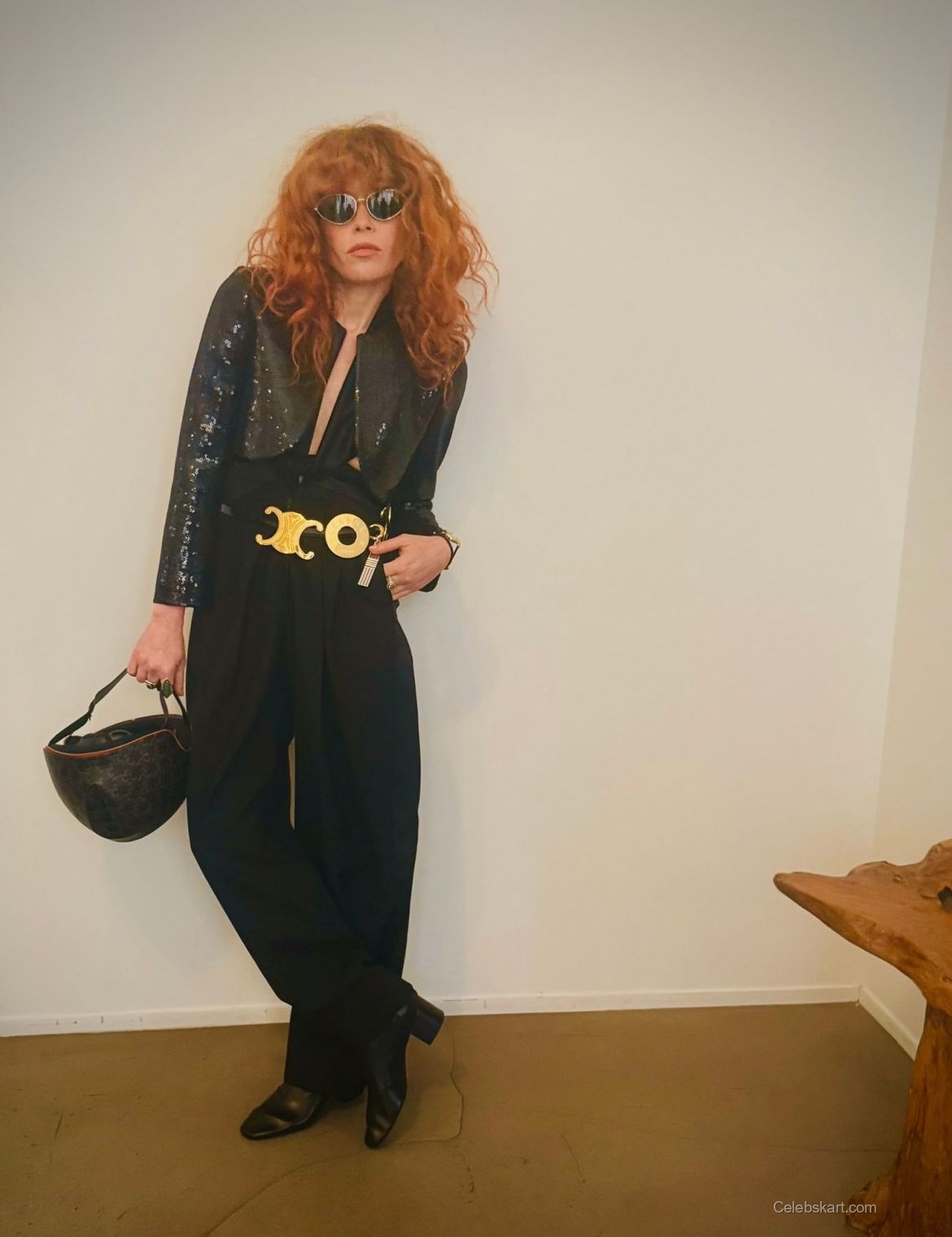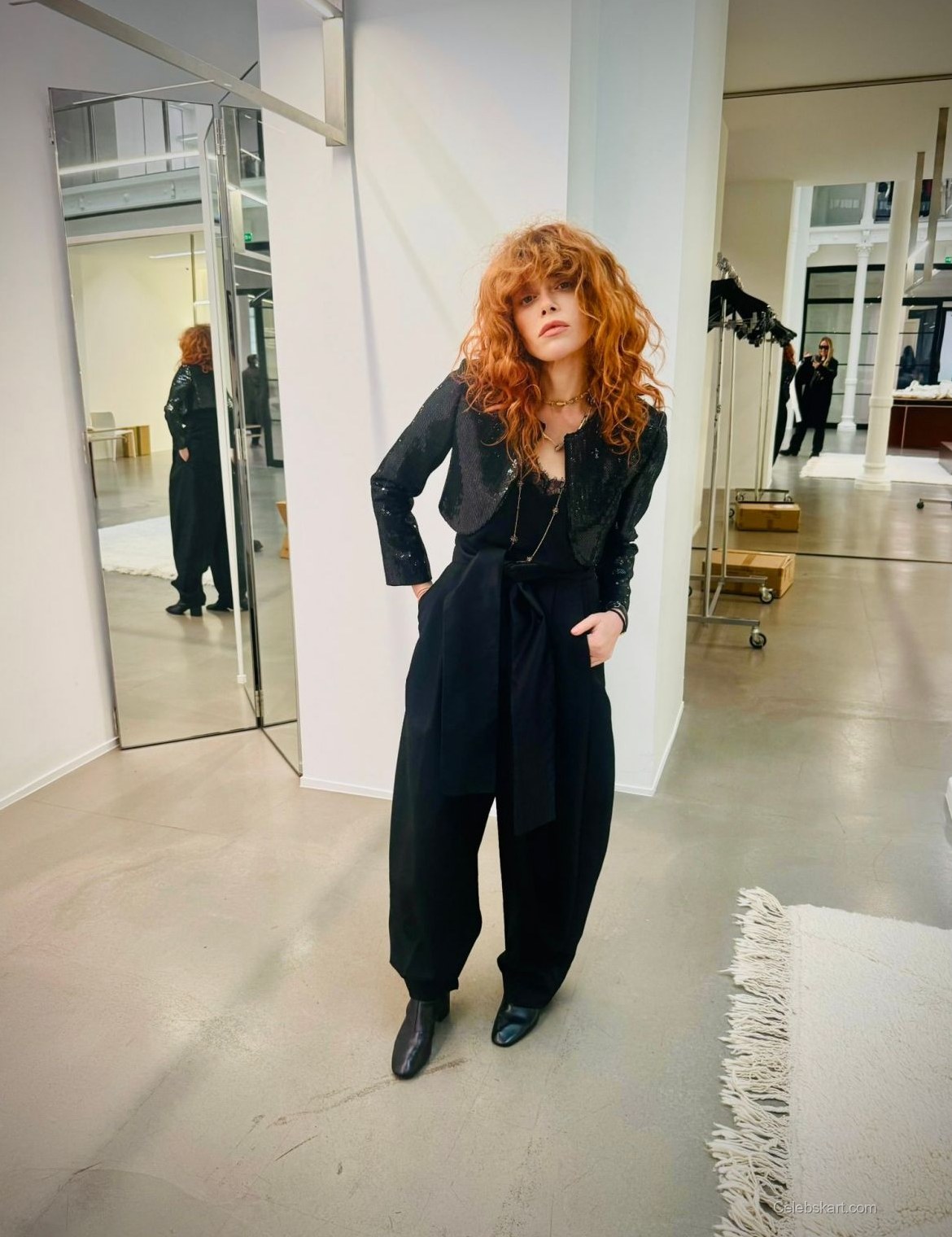 Natasha posed confidently, leaning against a minimalist backdrop while adjusting her chic sunglasses. Her vibrant red curls framed her face, adding warmth to the overall ensemble. The playfulness in her expression, paired with the fashion-forward outfit, made for striking visuals. As the light reflected off her sequined jacket, it became a focal point of interest.