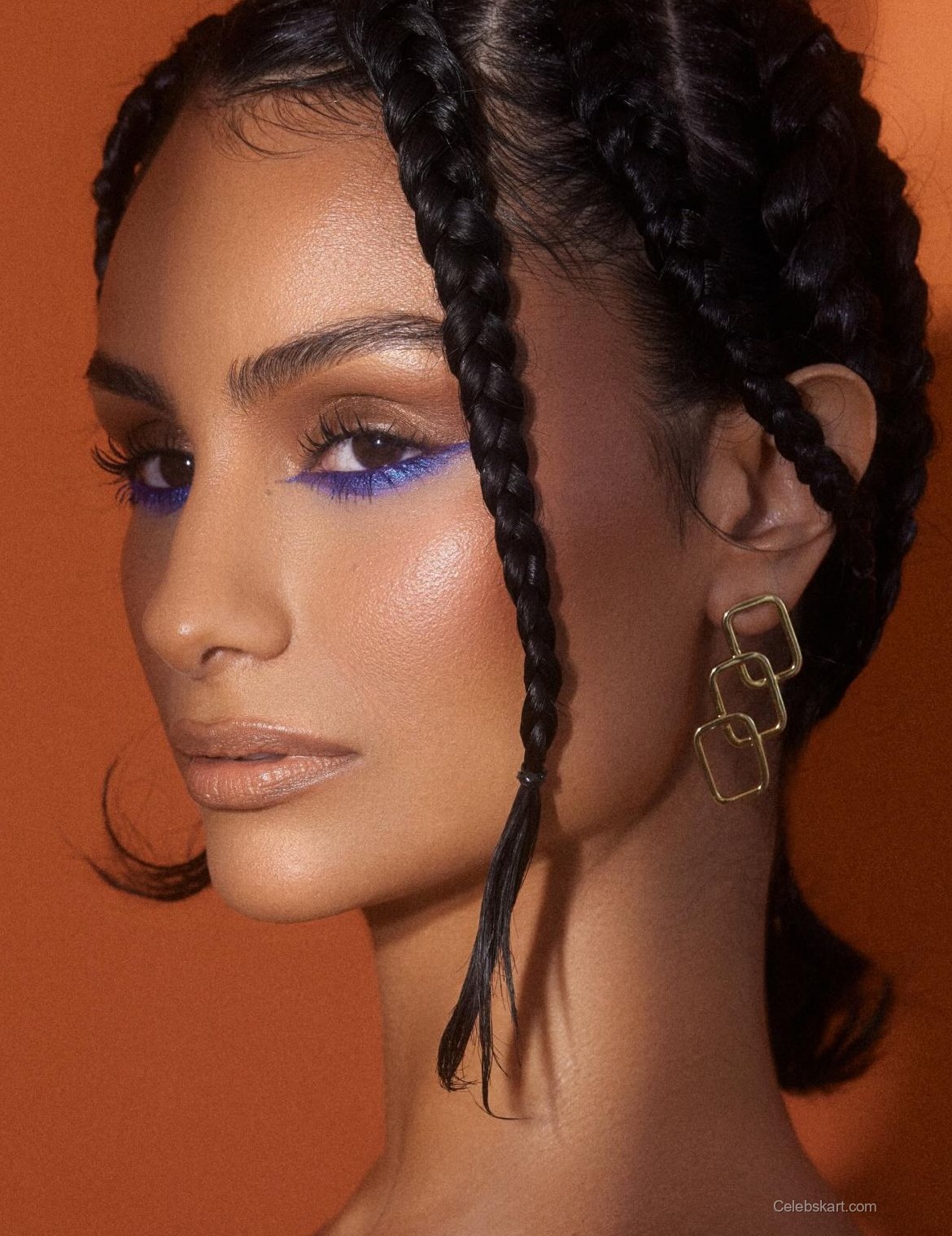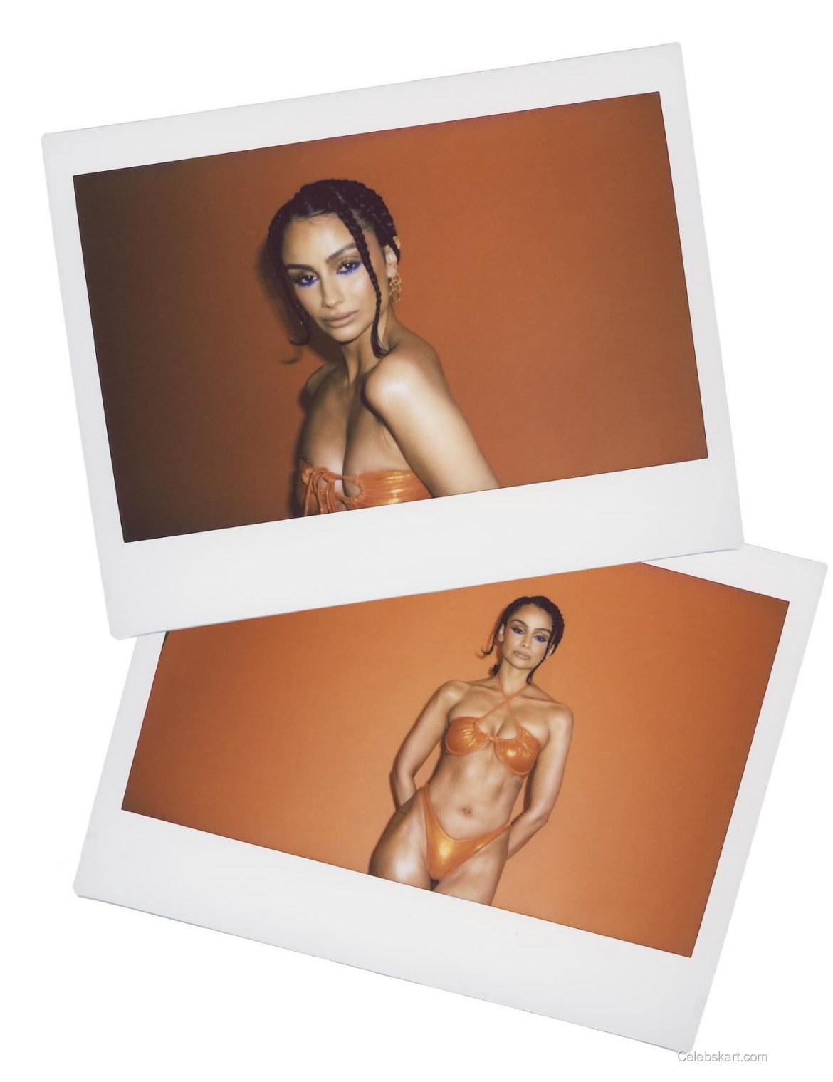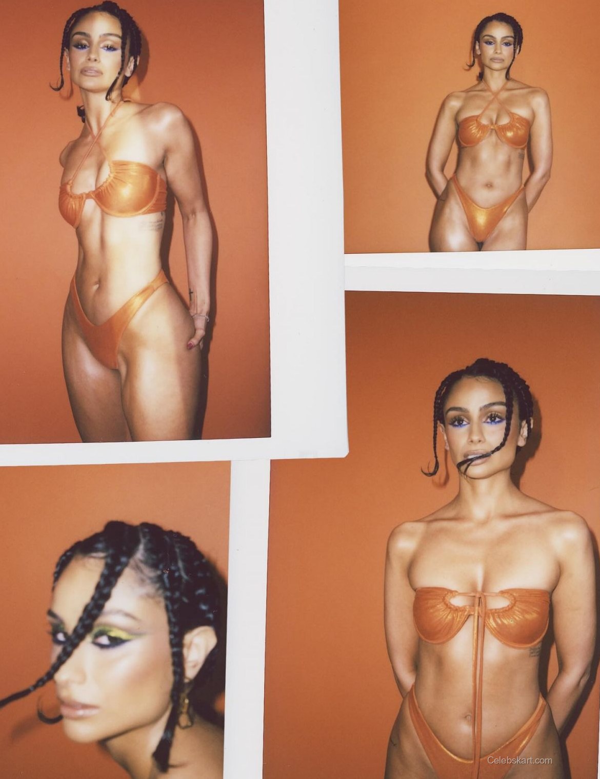 In each photo, Nazanin poses confidently against an orange backdrop, which enhances her bikini's vivid hue. Standing with one leg slightly forward, she exudes a relaxed yet empowered vibe. Her makeup includes bold, blue eyeshadow that contrasts elegantly with the orange tones, adding to her captivating presence.