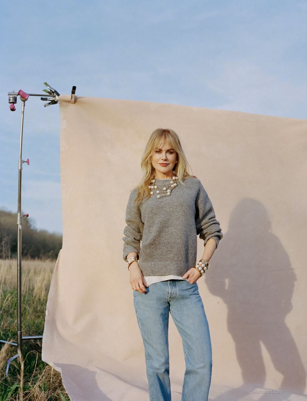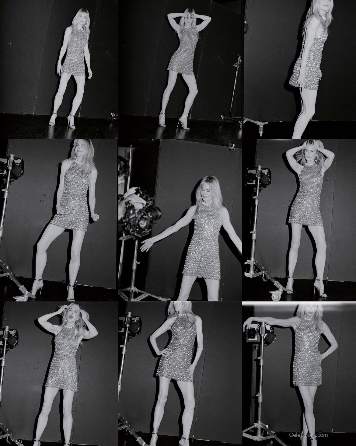The shoot for Vogue China features Nicole Kidman in a blue mesh gown. The gown accentuates her silhouette with its strapless design. The shimmering fabric reflects light, creating visual interest. The styling includes a pair of elegant earrings that add detail to her look. Each element complements the dress and enhances its appeal.