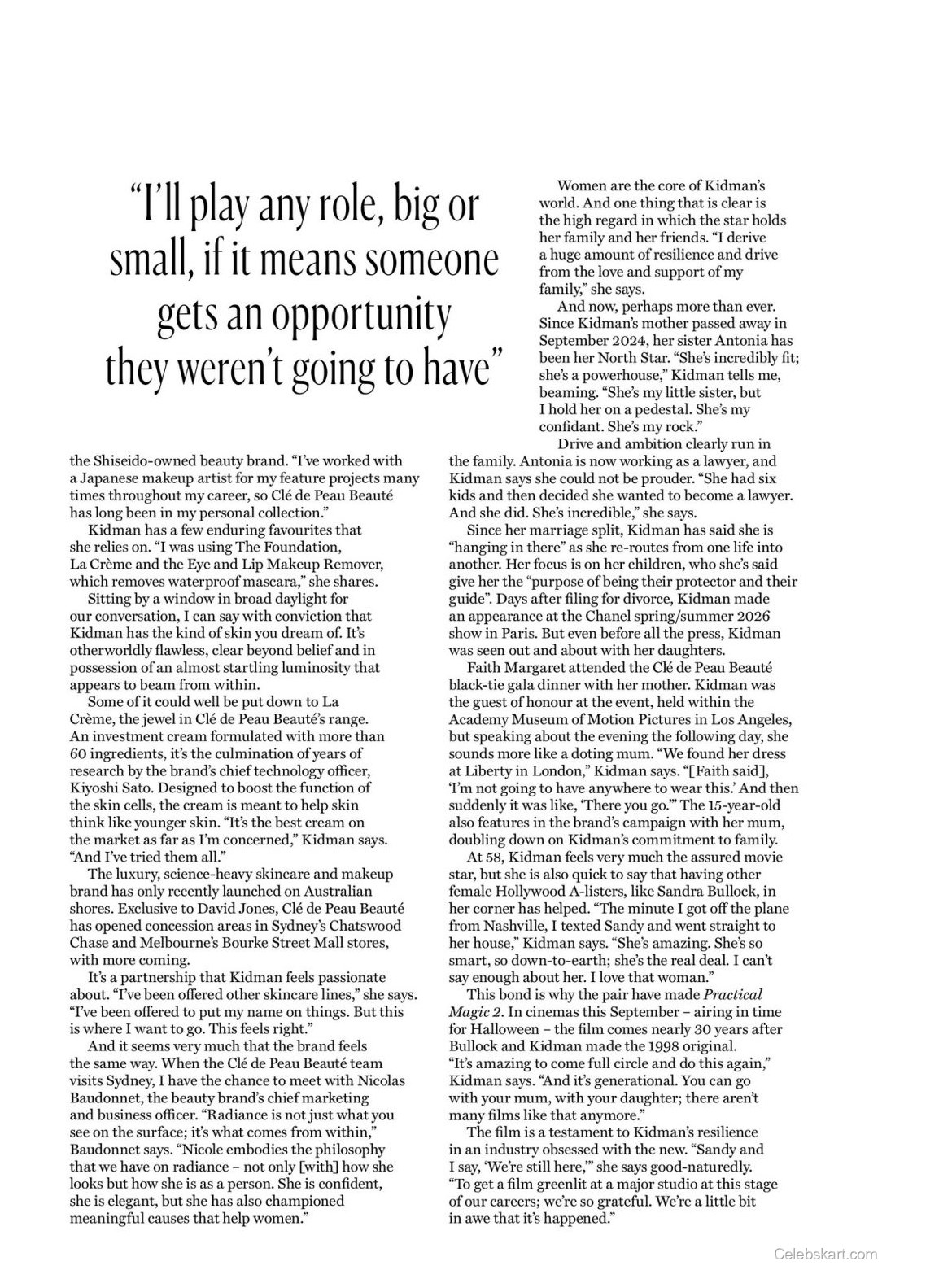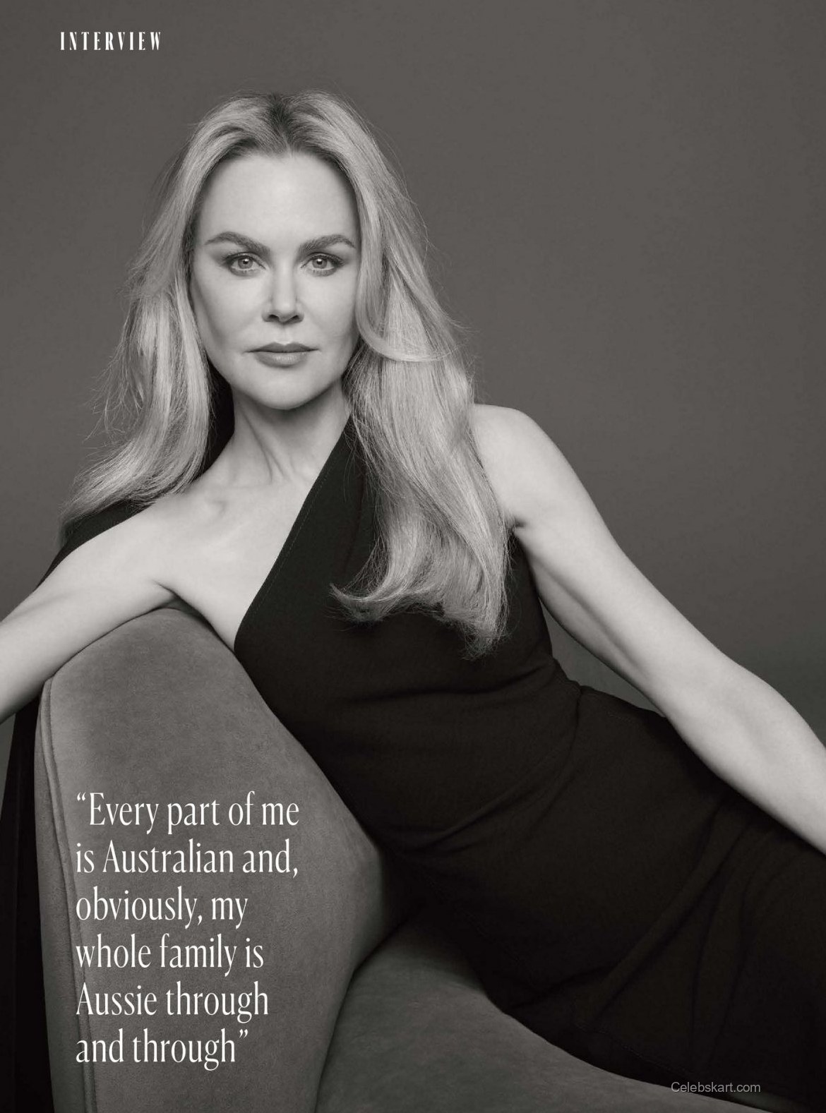 During the photoshoot, Kidman posed against a muted gray backdrop, allowing her outfit to take center stage. Her long, flowing hair frames her face beautifully, adding to the overall graceful aesthetic. With a warm smile and confident posture, she interacts with the camera, showcasing a variety of expressions that reflect her vibrant personality. This combination of fashion and confidence firmly establishes her presence in the editorial space.