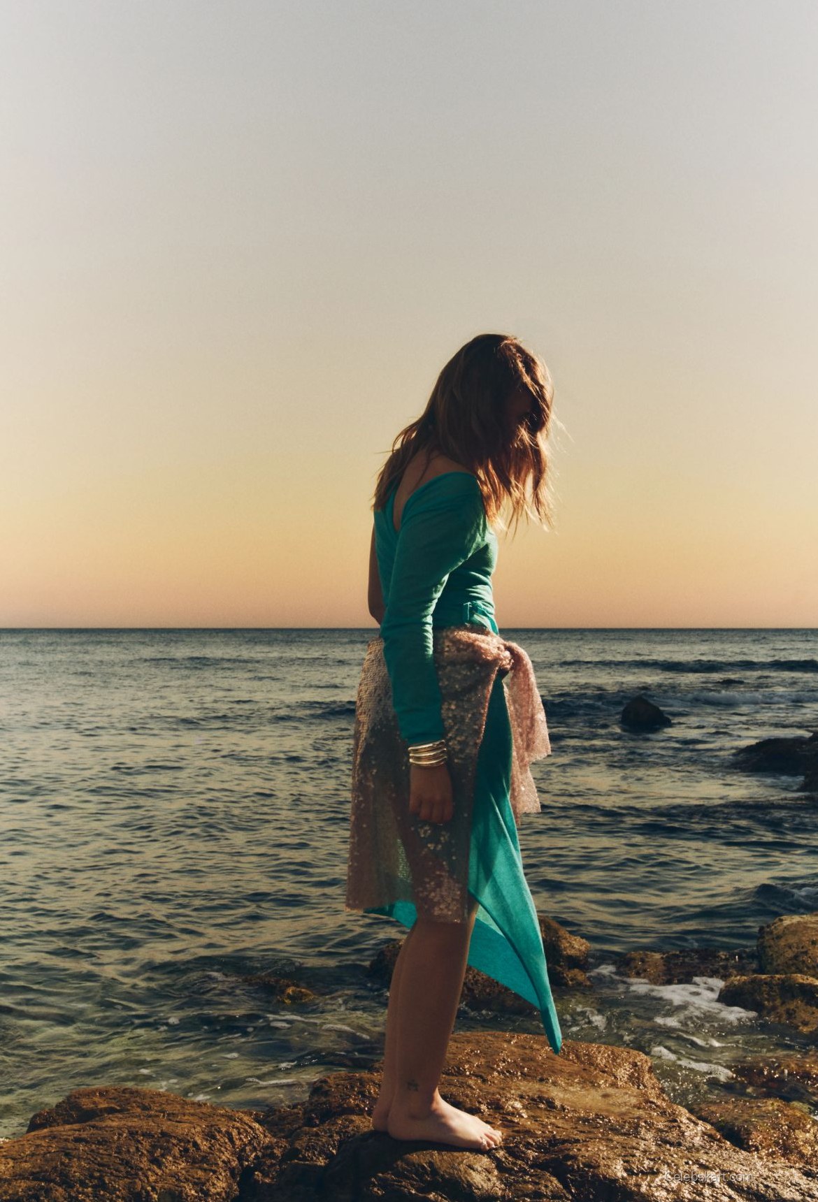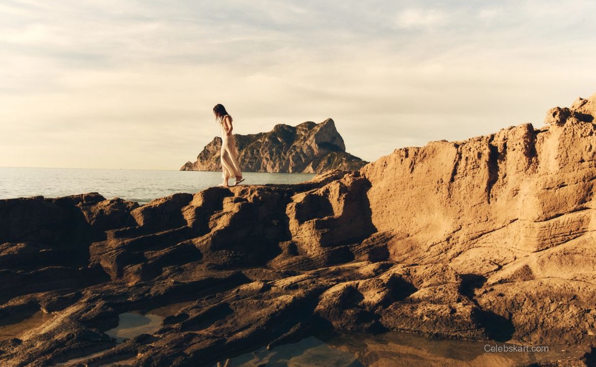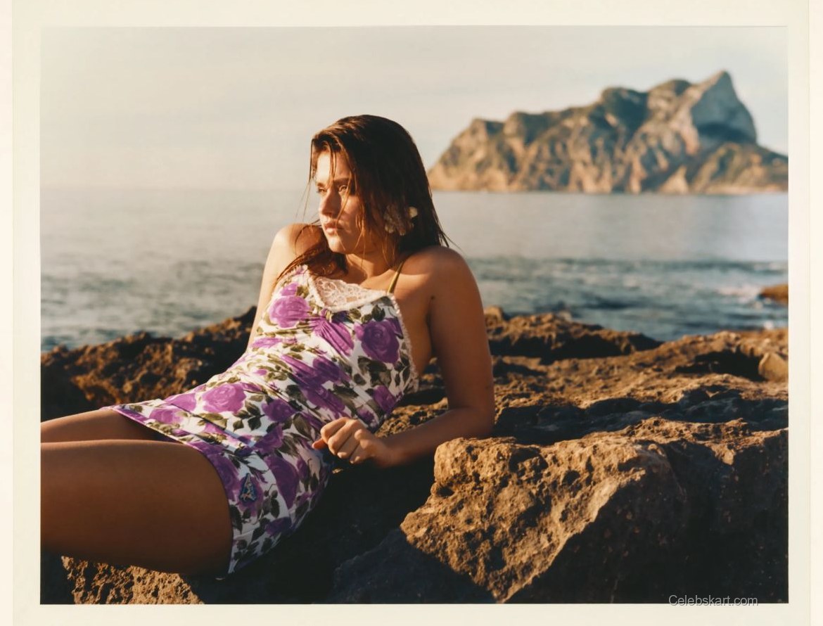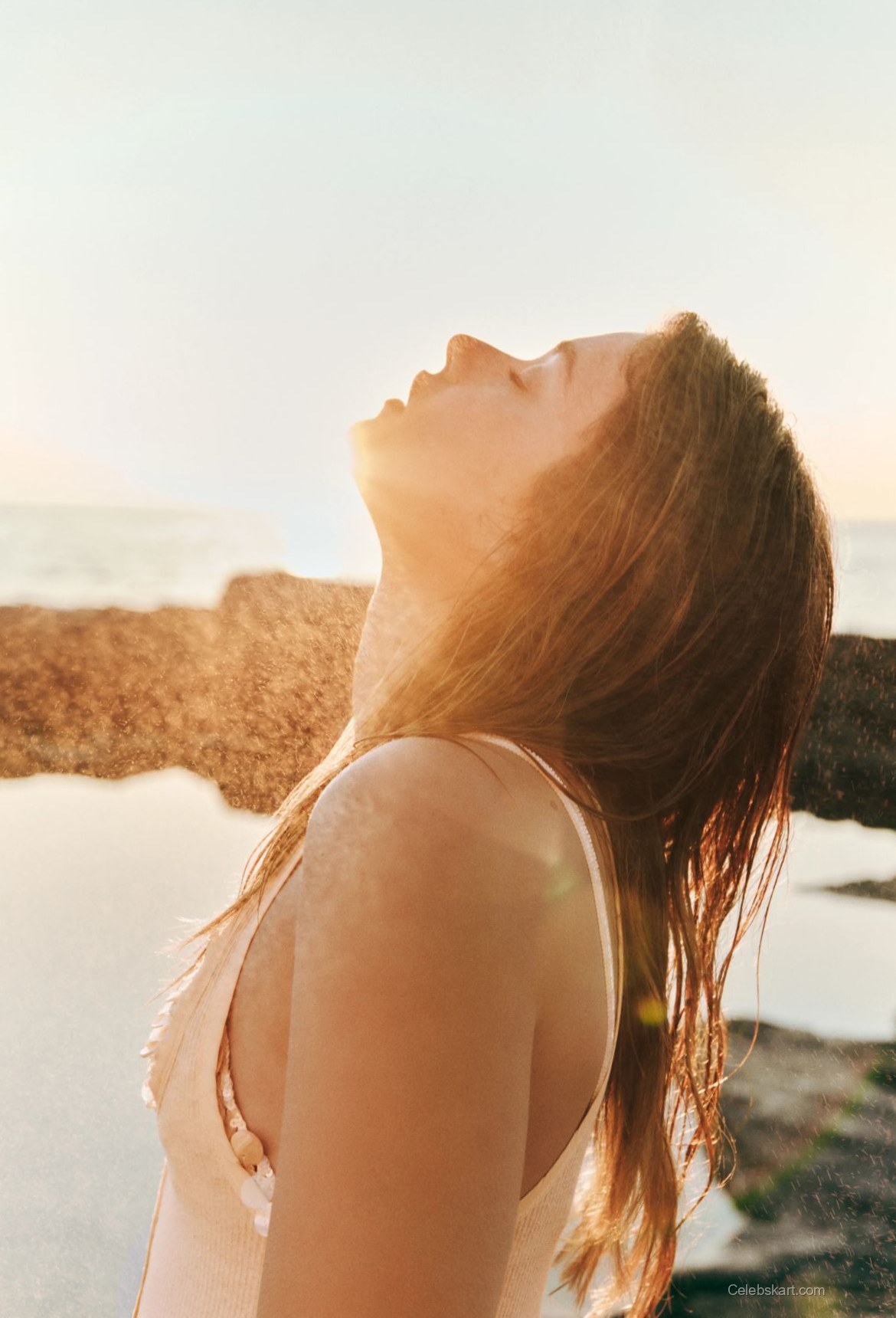 In this captivating shot, Nicole’s hair falls in loose, natural waves, slightly damp from the ocean, enhancing her effortless vibe. The backdrop features a picturesque seaside, with gentle waves lapping at the shore, adding to the tranquil mood of the photoshoot. Her expression is both contemplative and confident, making the viewer feel a connection to her in this serene moment.