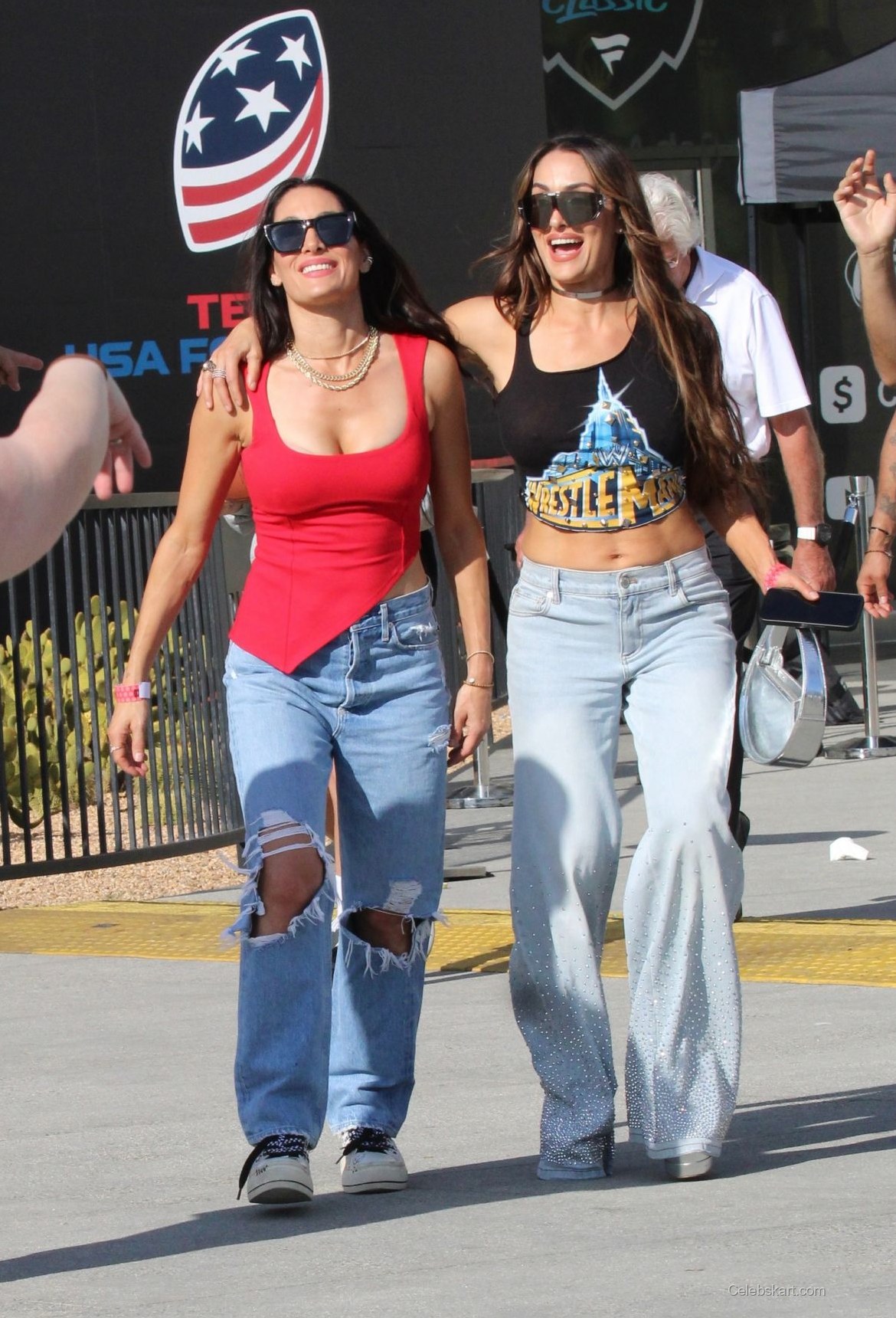 As the Bella twins walked through the venue, their outfits were front and center. Nikki wore a vibrant red top that hugged her figure comfortably and paired it with distressed light blue jeans featuring bold rips. The ensemble was complemented by sneakers, giving it a sporty yet stylish look. Brie, on the other hand, opted for a black cropped tank top that boasted a vintage wrestling graphic and high-waisted, sparkly pants that flared out, adding a touch of glam to her casual wear. Both looks exemplified a blend of comfort and style, making them ideal for an energetic event.
