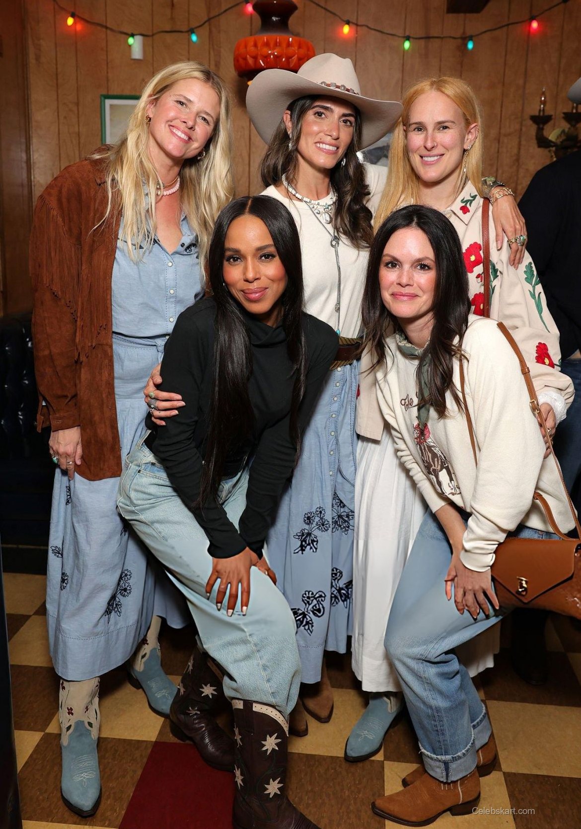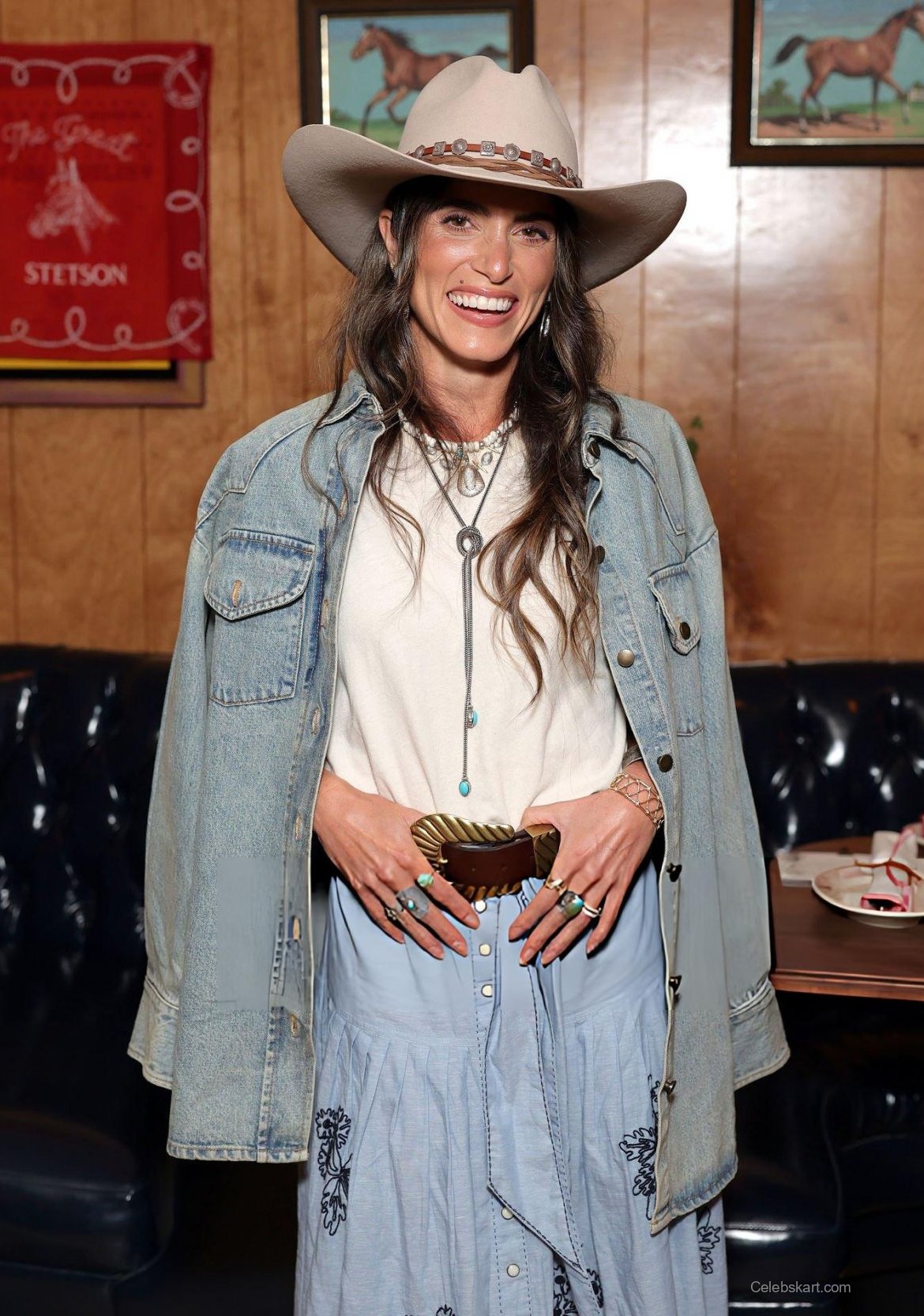 This look from Nikki Reed at the Stetson launch is a testament to her artistic fashion sense. The combination of a denim jacket with feminine elements like the embroidered skirt creates an eye-catching balance. The accessories not only draw attention but also express her personality. The layered jewelry, coupled with the larger statement belt buckle, adds visual interest and depth to her outfit while still aligning with the theme of the event.
