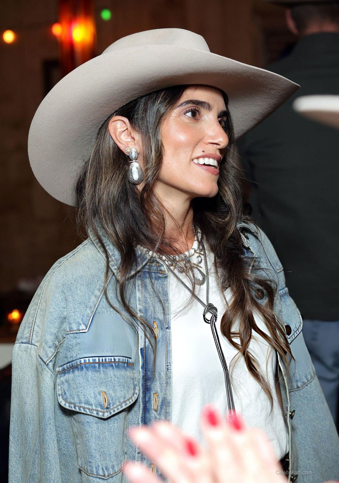 As she mingled with attendees, Nikki posed gracefully, smiling widely in pictures. Her natural charm was accentuated by her accessories—layered necklaces with turquoise pendants and statement rings added a pop of color and character to her outfit. The backdrop of the rustic event space, complete with wooden walls and vintage horse paintings, provided a warm and inviting atmosphere, enhancing her overall appearance.