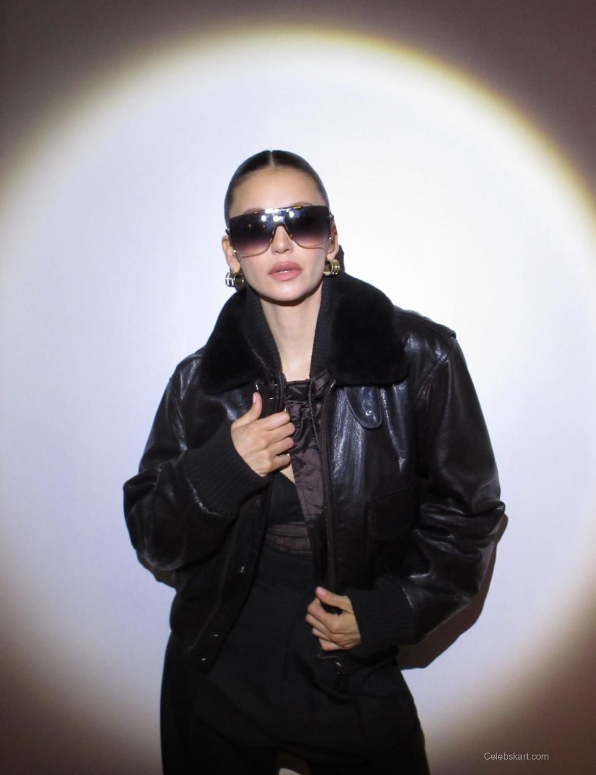 Standing out with a bold black leather jacket, Nina’s outfit was a perfect mix of sophistication and edge. The jacket featured soft fur accents that added a touch of luxury, complemented by tailored black trousers. Accessories played a significant role; her oversized sunglasses added a modern flair, harmonizing beautifully with the overall aesthetic.