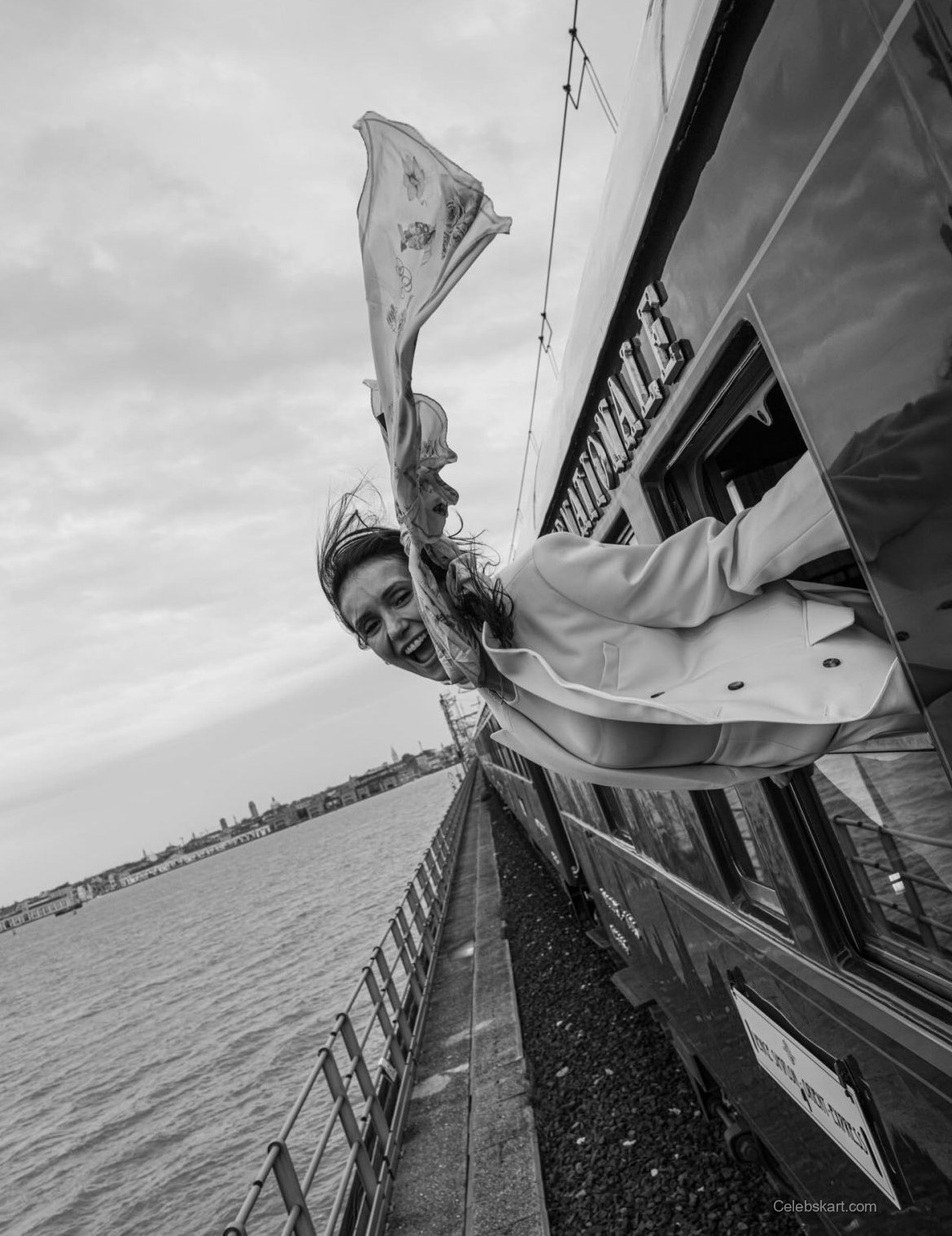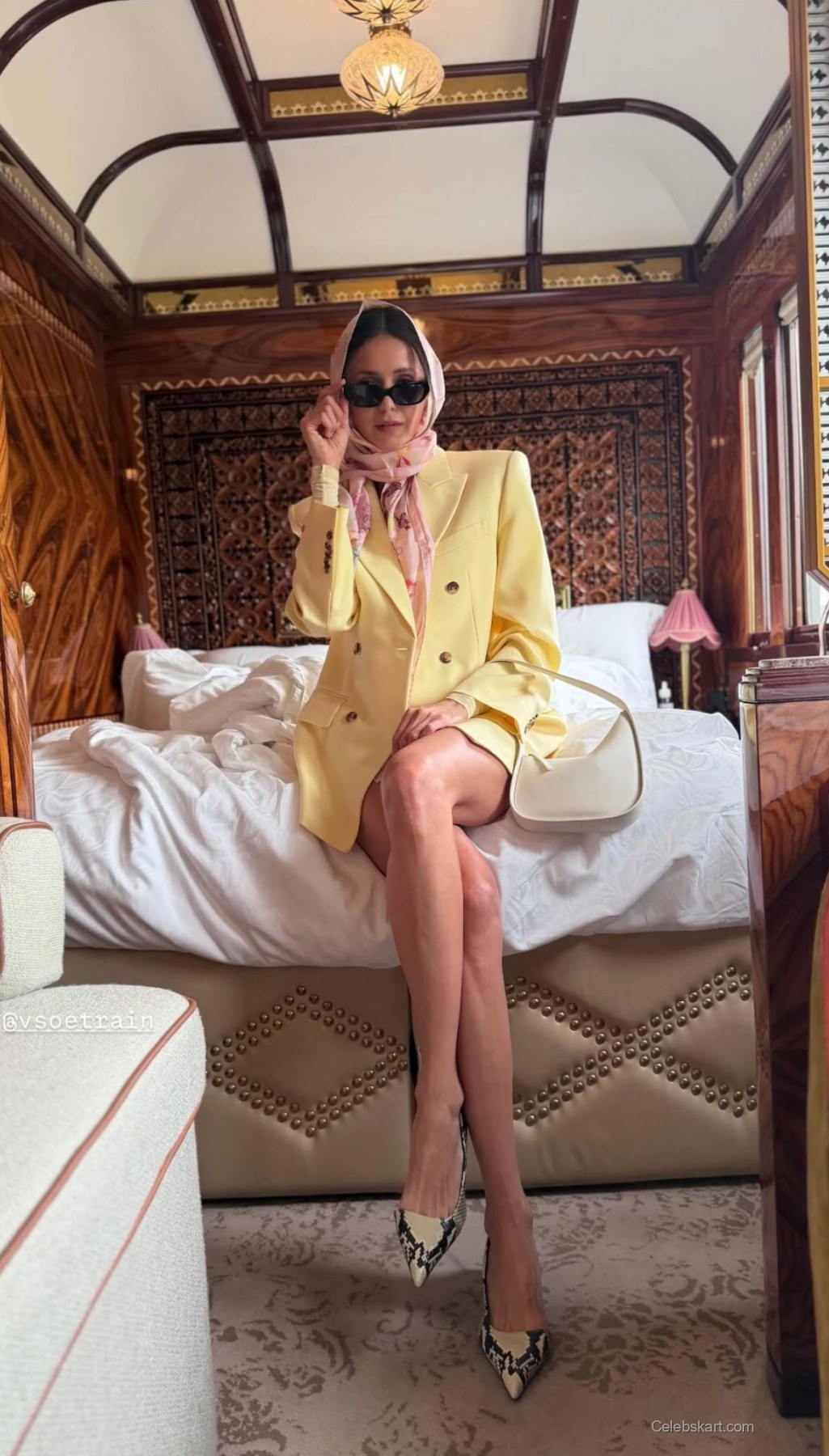 Nina Dobrev's outfit at the luxury event consisted of a bright yellow double-breasted blazer worn over a matching mini skirt. She paired this ensemble with a delicate pink scarf, elegantly draped around her neck. The black sunglasses added a chic touch, making her look stand out. Her pointed heels featured a reptile print, adding a trendy edge to the outfit.