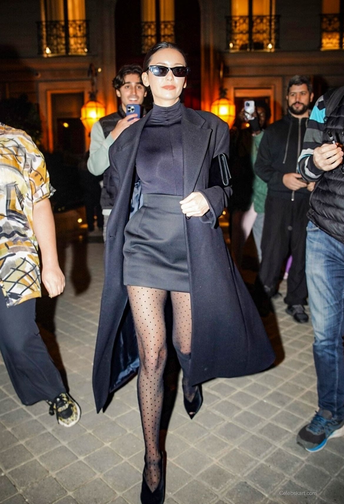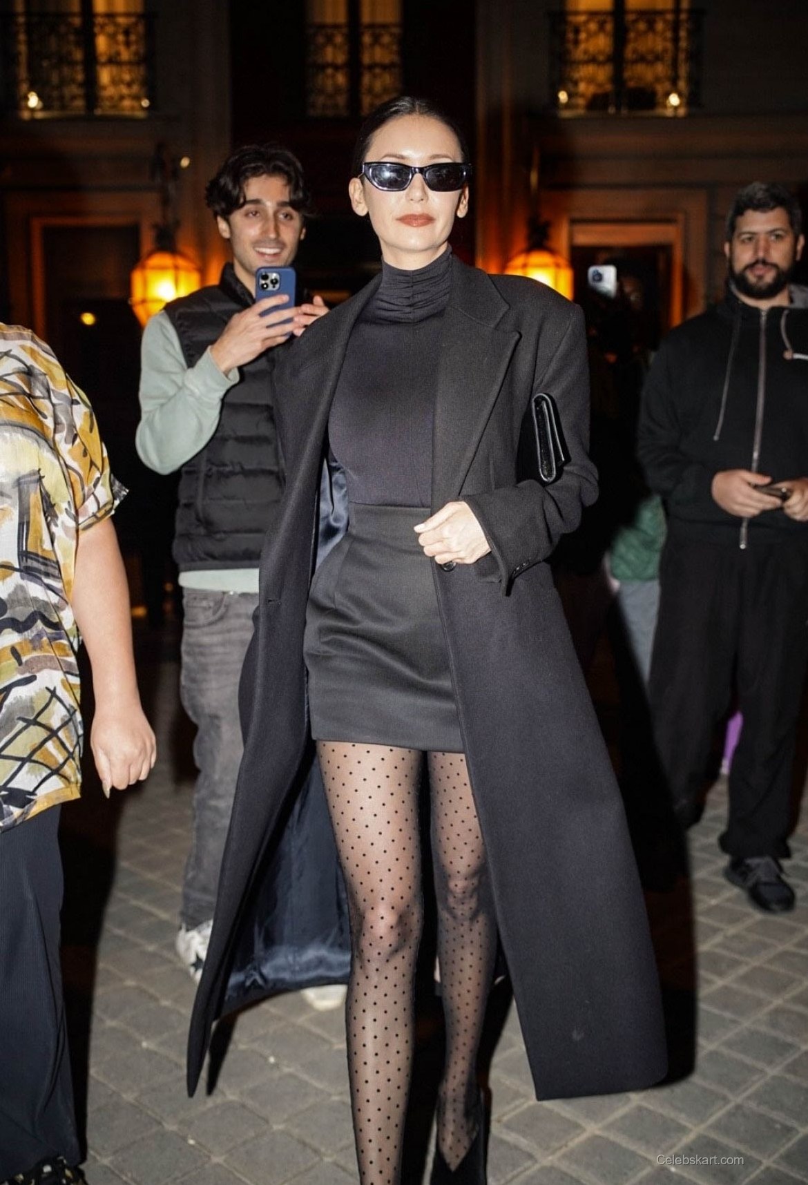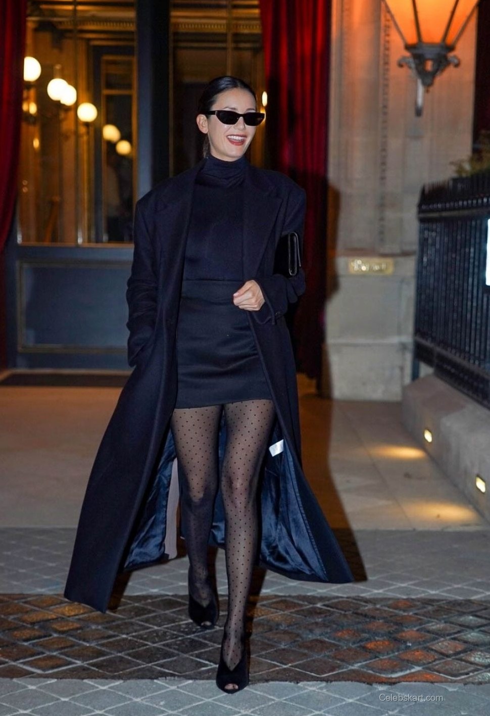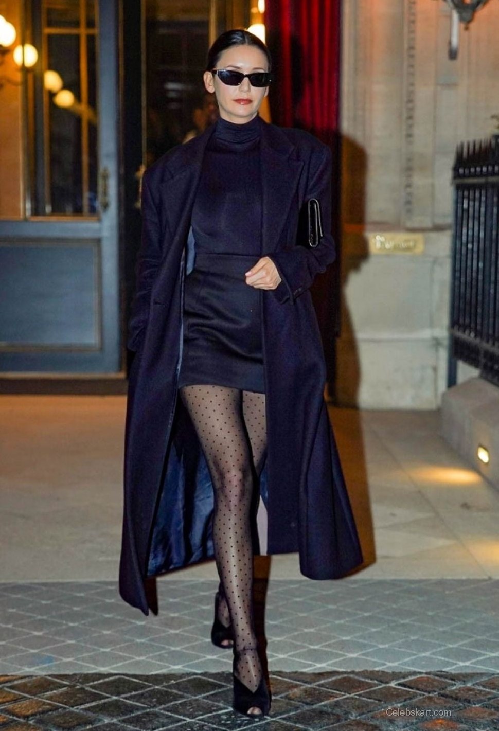 Emphasizing modern elegance, Nina wore a sleek black turtleneck paired with a fitted mini skirt. The outfit was complemented by her striking black trench coat, which fell gracefully around her. A standout feature of her look was the playful polka-dot tights that added a unique flair. With pointed black heels, her outfit balanced chic and playful beautifully.