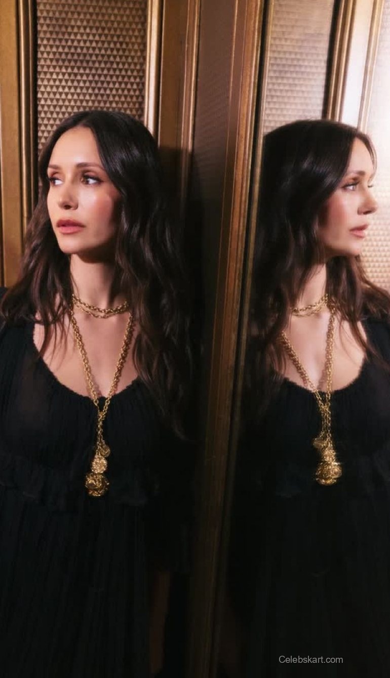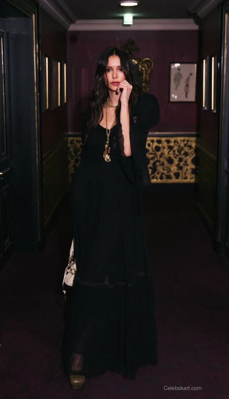 Nina Dobrev's look was anchored by a flowing black dress that featured delicate pleats and enchanting silhouette. The soft fabric draped beautifully, accentuating her figure. The standout piece of her outfit was a striking gold necklace, which added a luxurious touch to her overall appearance. The neckline of her dress gracefully framed her shoulders, amplifying the visual impact of her outfit.