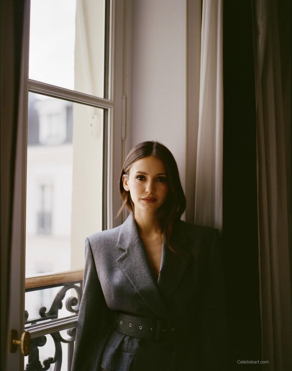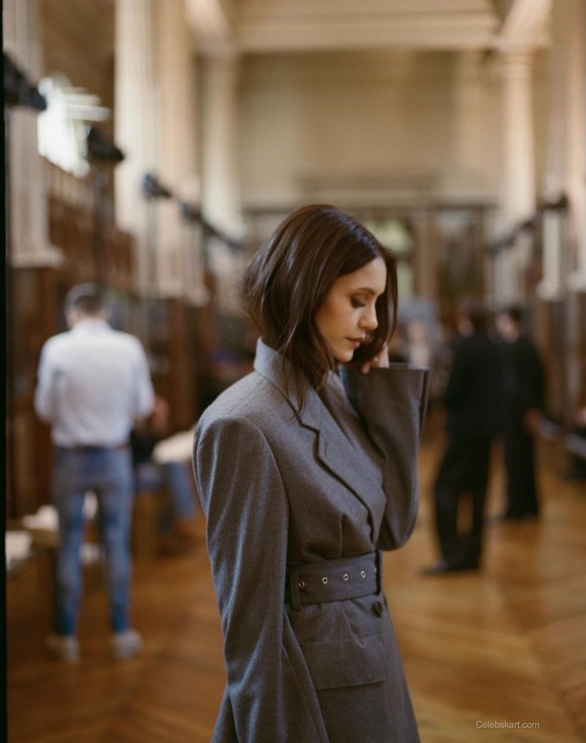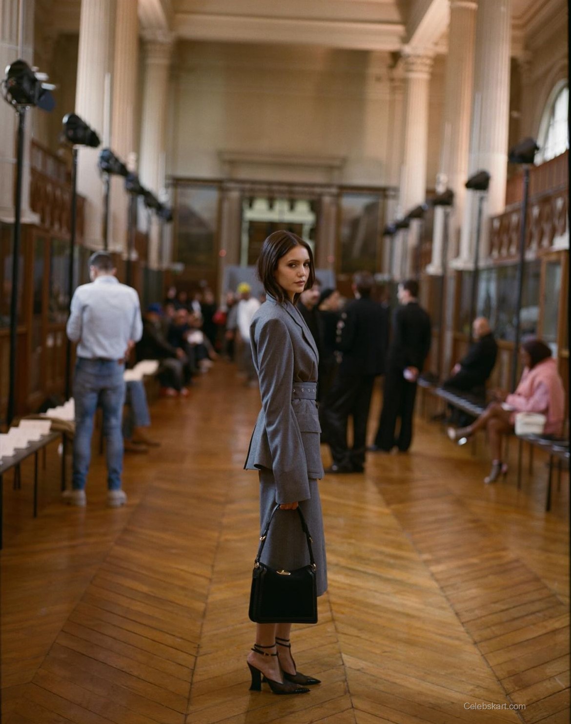 During the event, Nina posed confidently, with one arm resting on the windowsill as she gazed outside, naturally exuding an air of sophistication. The setting added a touch of drama, with the Parisian backdrop accentuating her look. Her dark hair framed her face beautifully, lending a soft touch to the structured elements of her outfit. For more examples of her dynamic presence at events, see Nina Dobrev's red carpet appearances.