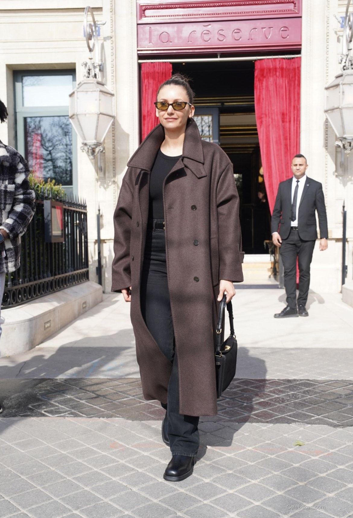 This outfit stands out not only for its chicness but also for its practicality. The oversized coat is perfect for the unpredictable spring weather in Paris, making it both stylish and functional. The combination of dark hues highlights her sophisticated fashion sense, appealing to fans who admire her ability to blend comfort with style.