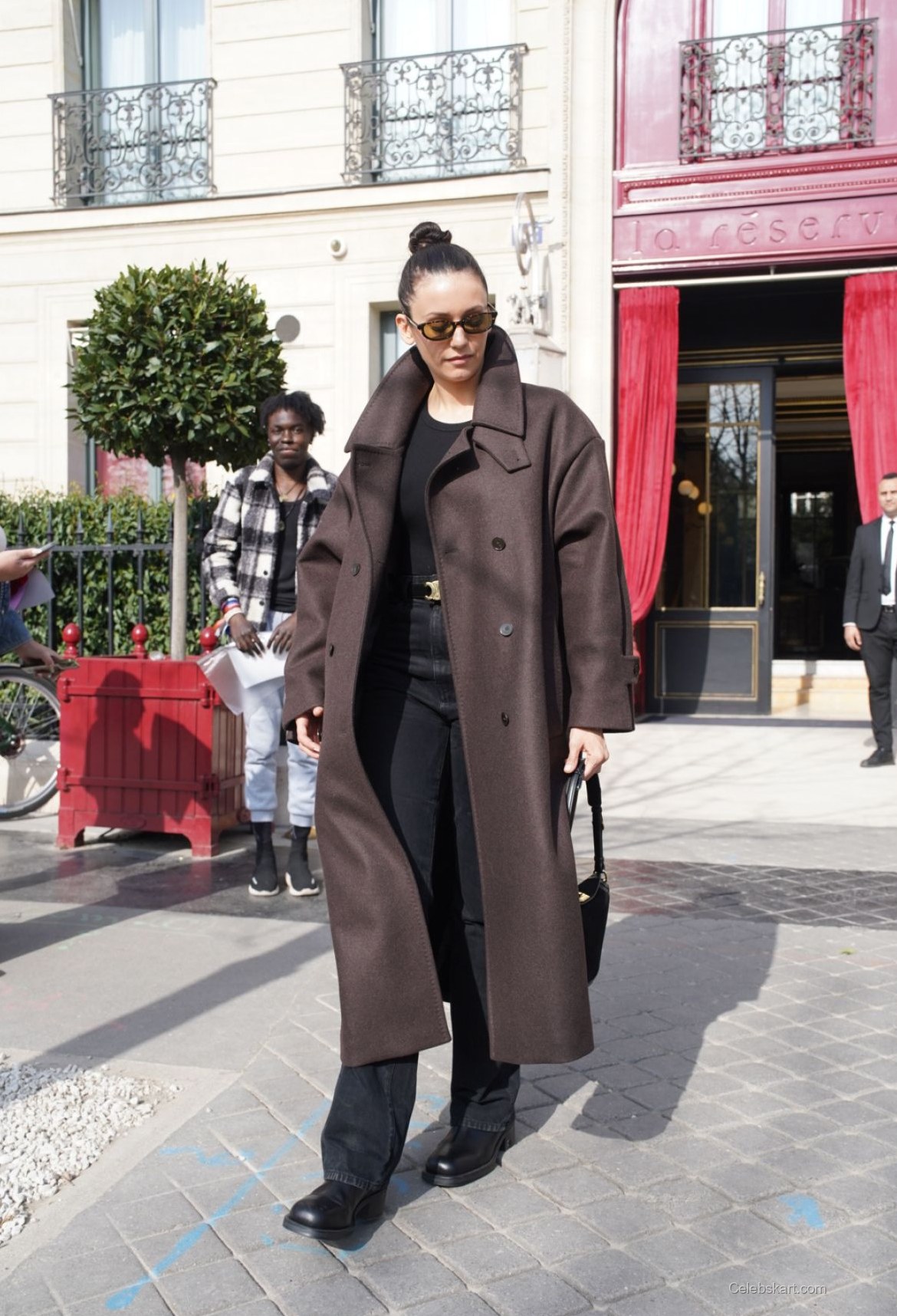 Her outfit featured a fitted black top paired with high-waisted black jeans, creating a sleek silhouette. The oversized brown coat adds a layer of sophistication, while the gold belt cinches her waist, highlighting her figure. To complete the look, she accessorized with stylish sunglasses and a black bag, perfect for the Parisian spring.