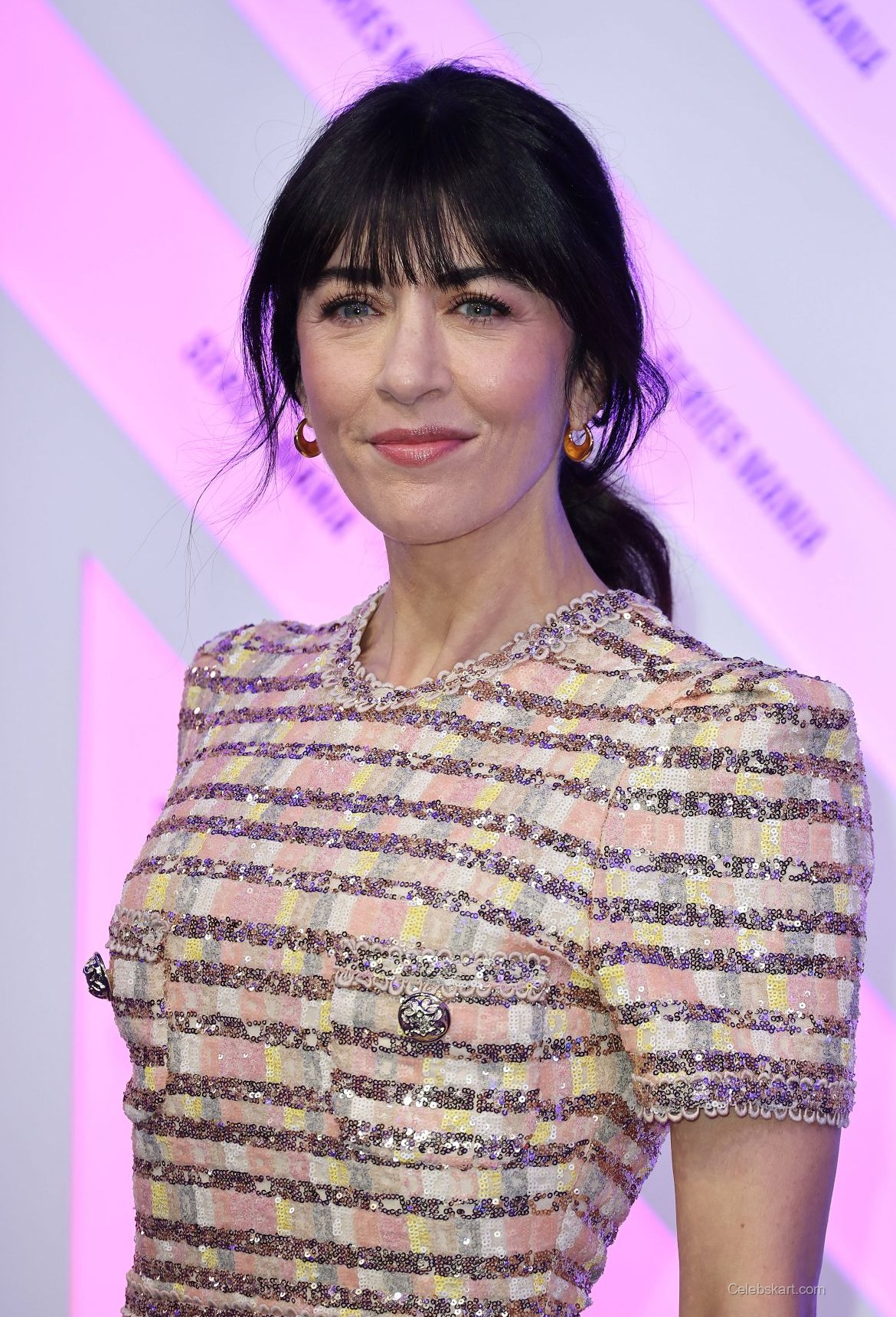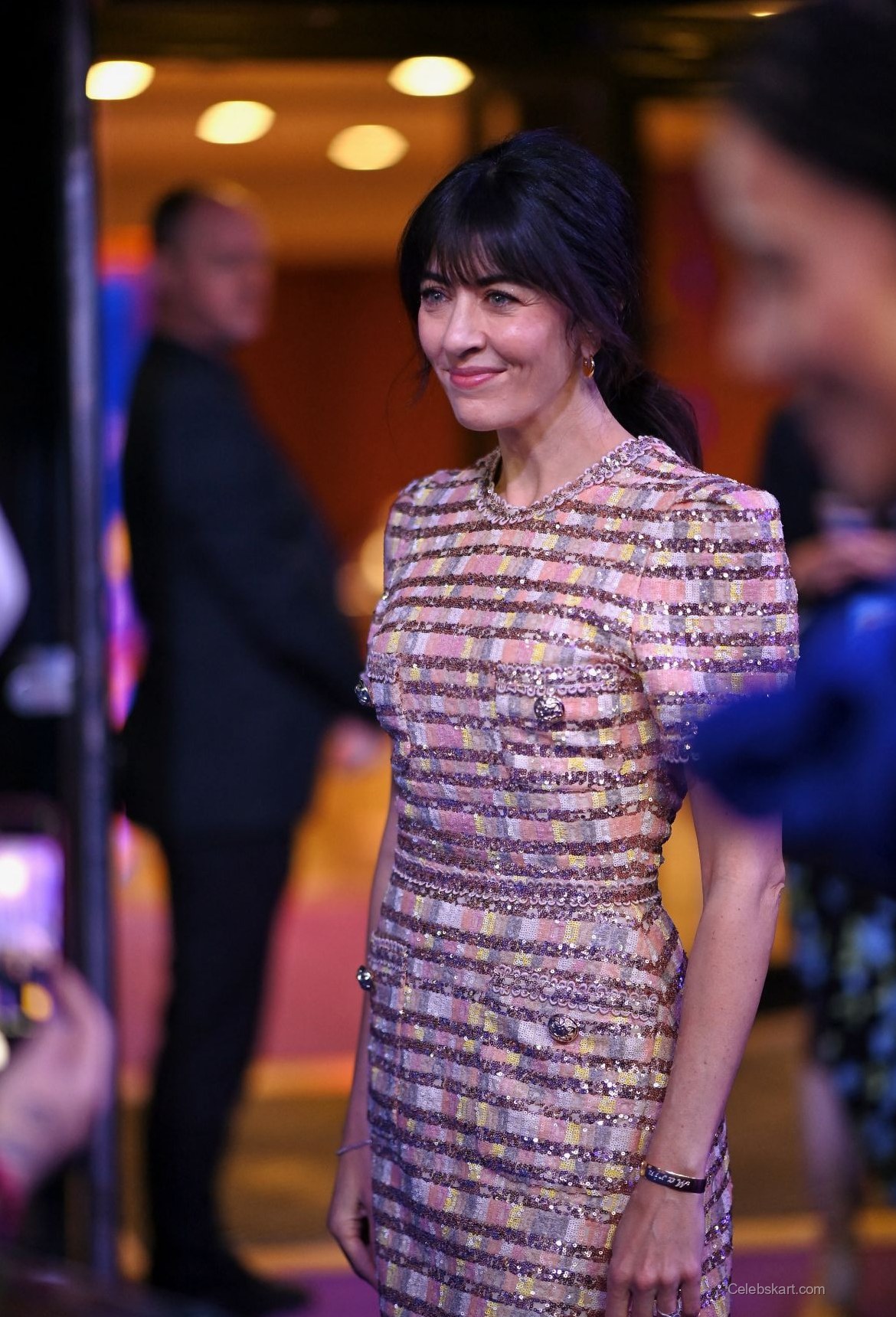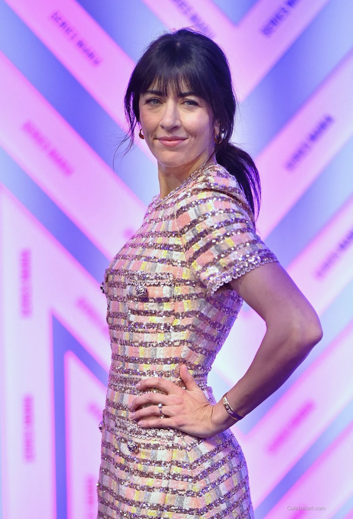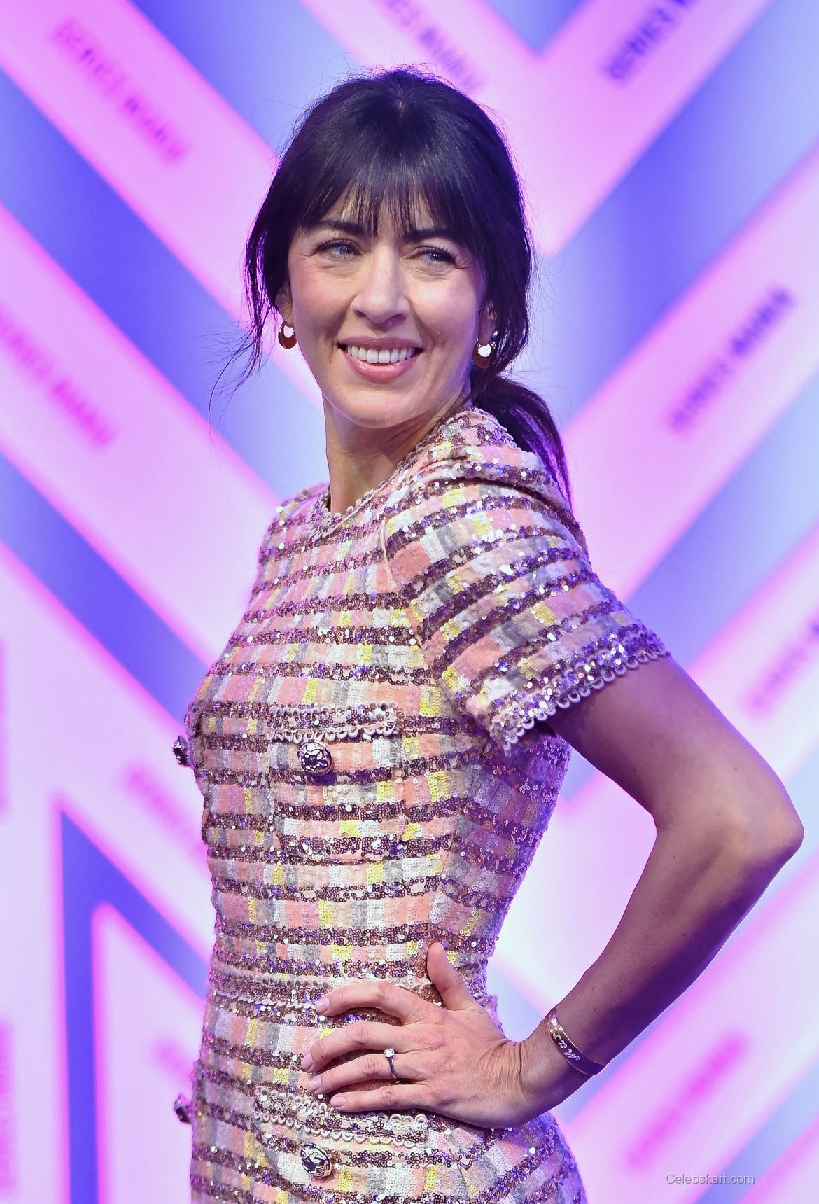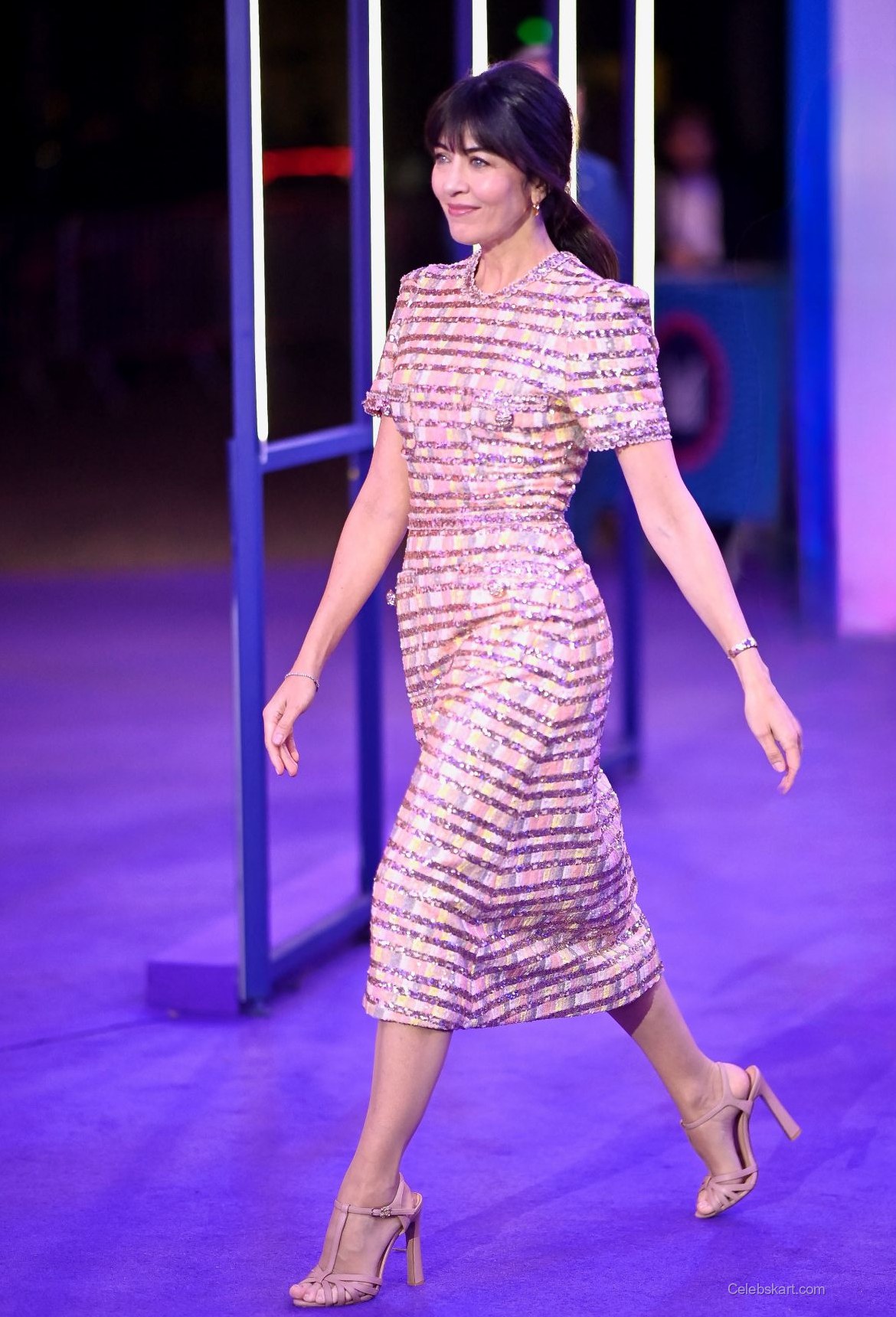 Wearing a beautifully tailored dress, Nolwenn’s look featured striking pink and gold horizontal stripes, exuding a sense of modern glamour. The delicate sequins created a shimmering effect that caught the light as she moved. Adding sophistication, the dress included two functional pockets adorned with unique embellishments that enhanced its visual interest.