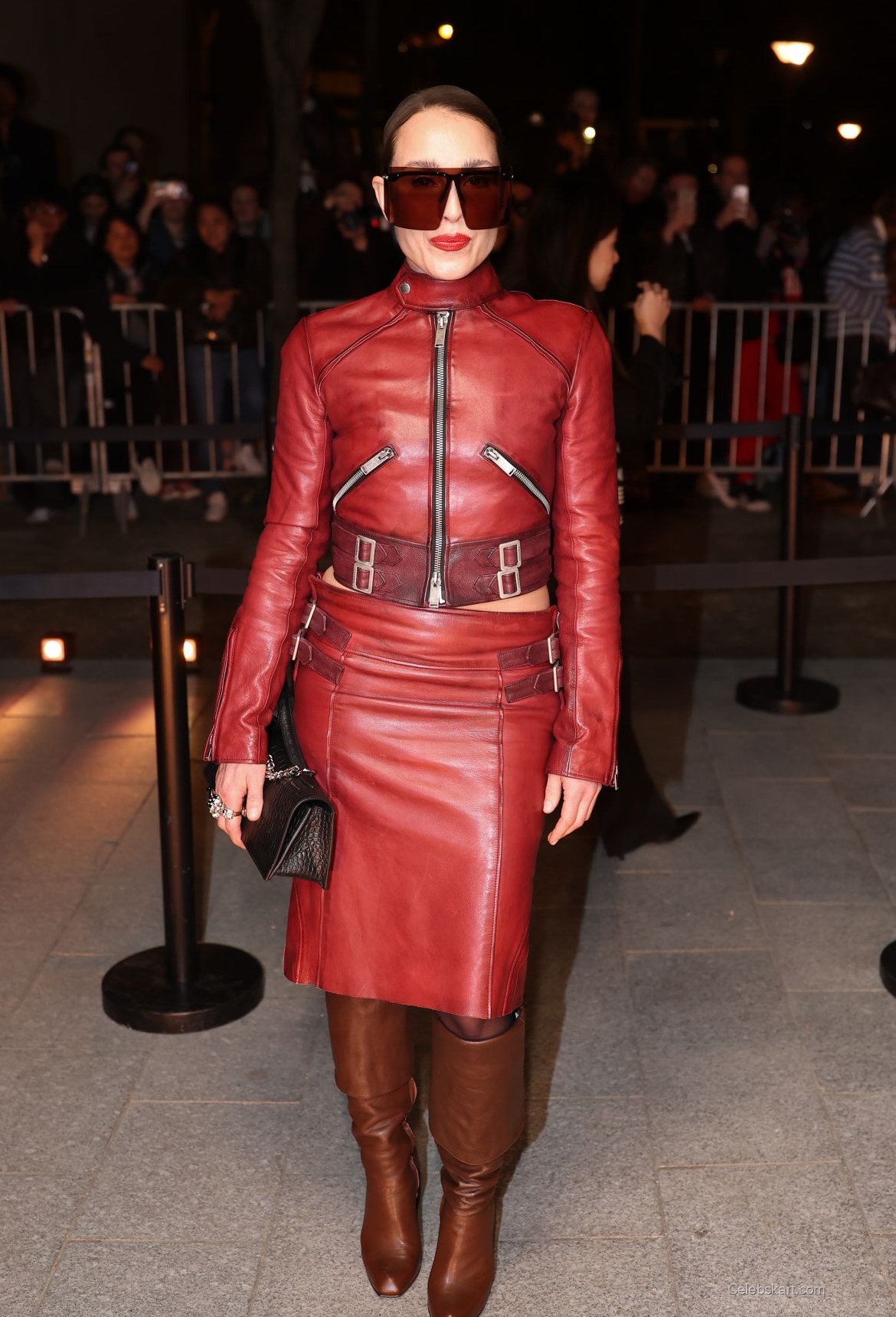 The stunning outfit included a matching red leather skirt that cascaded down to her calves, adding a touch of sophistication. The jacket’s intricate detailing, including zippers and belts, complemented her chiseled silhouette. Notably, she paired the outfit with knee-high brown boots, which provided a stunning contrast to her bold top layer. This footwear choice not only elevated her height but also added an edge to the overall look.