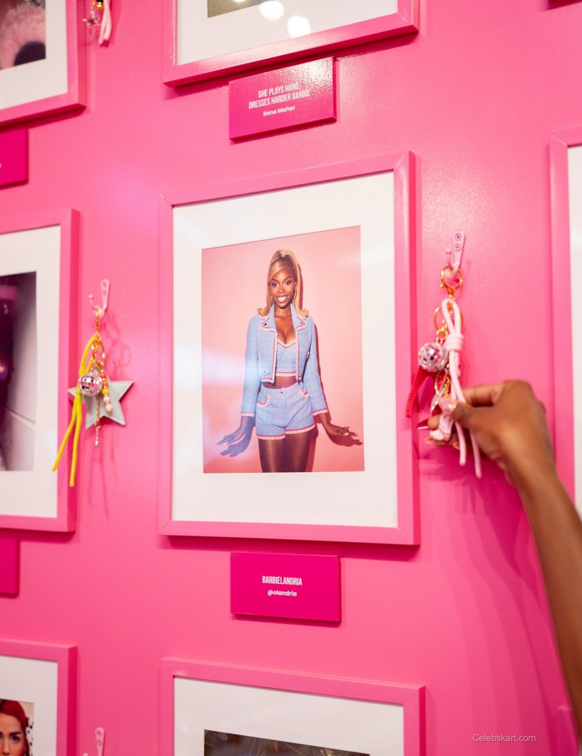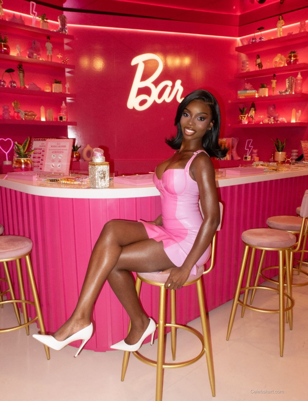 In the image, Olandria strikes a playful pose, with one leg crossed and her hand elegantly extended. The soft pink background contrasts beautifully with her outfit, creating a vibrant yet harmonious visual. Her hair is styled in loose waves, framing her face and enhancing her cheerful expression. The overall mood of the photo is lively and inviting, showcasing Olandria's personality and style.