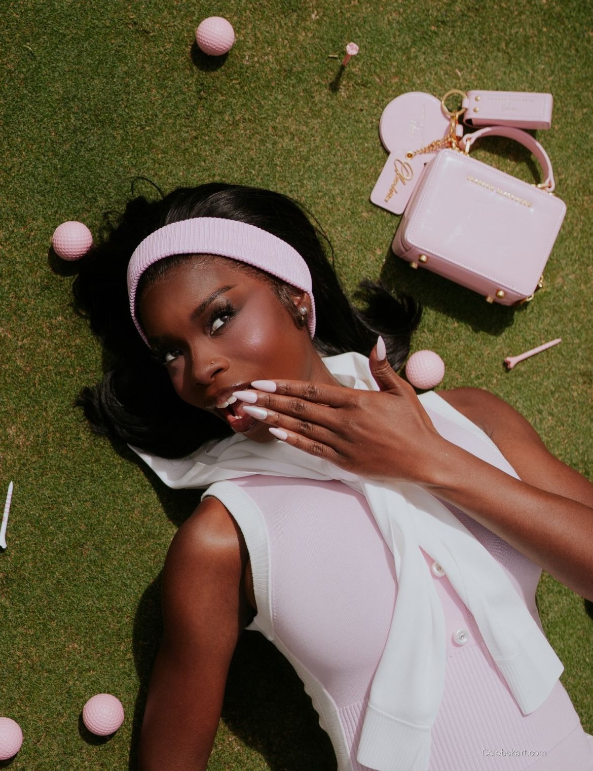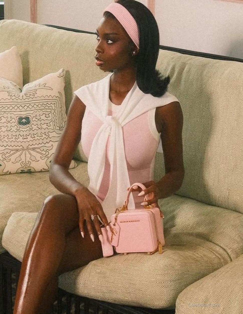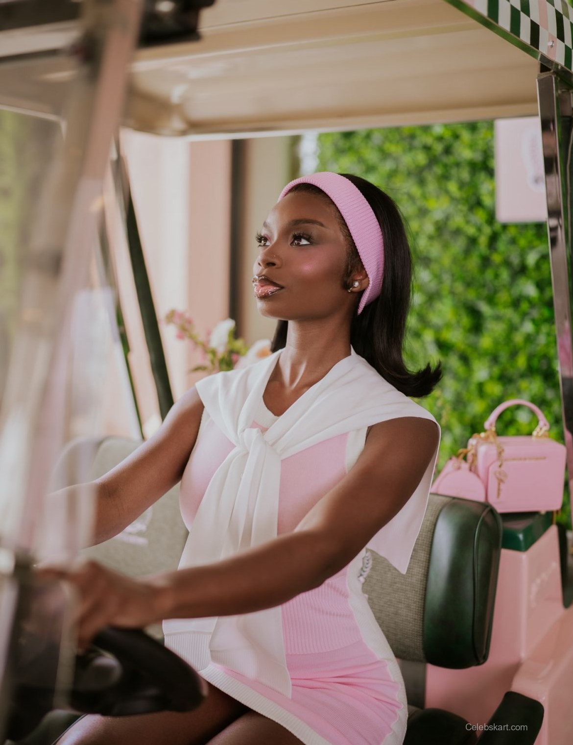Olandria wears a playful outfit that consists of a fitted pink top paired with a stylish skirt that combines pink and white hues. The top is made of ribbed fabric, enhancing her silhouette, while the skirt adds a touch of flair with its contrasting colors. Completing her look, she drapes a light white sweater around her shoulders, giving off a casual yet chic vibe. Her accessories include a striking pink handbag that matches her outfit beautifully, along with a round charm that adds personality to her ensemble.