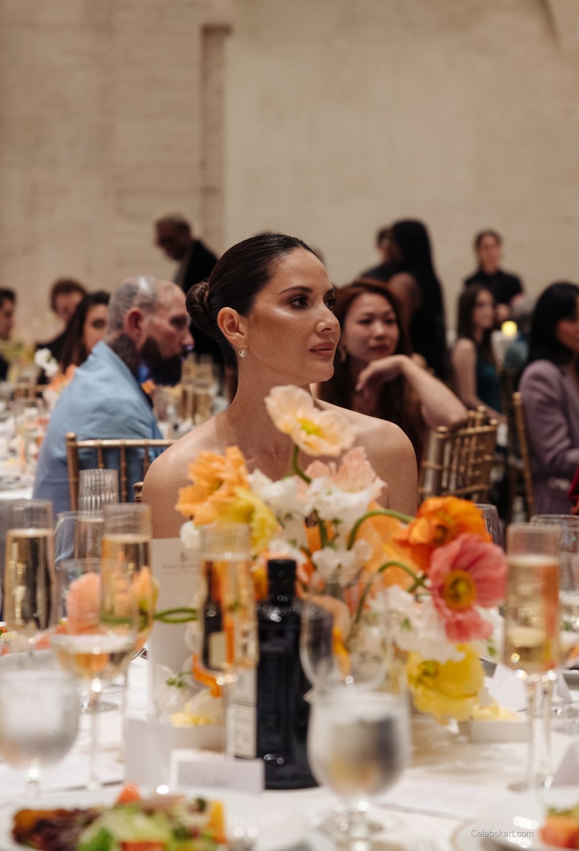 Munn was seen posing elegantly on the red carpet, exuding confidence as she smiled for photographers. The lively atmosphere was enhanced by her poised gestures as she interacted with attendees, conveying warmth and engagement. Holding a bouquet, she descended the steps gracefully, highlighting the event's festivities against the backdrop of the historic venue.
