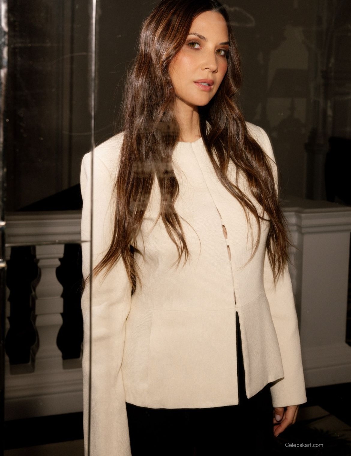 Olivia Munn's outfit centered around a beautifully tailored cream blazer. The blazer featured a unique cut, with a slight peplum that added a feminine touch. Its clean lines and structured design were complemented by a pair of sleek black pants, which created a striking contrast. The blazer's button closure was subtle, allowing the overall look to maintain an air of elegance. Munn’s long hair cascaded down her shoulders, providing a soft frame to her face, which was perfectly styled for the occasion. This combination of colors and styles made her stand out effortlessly.