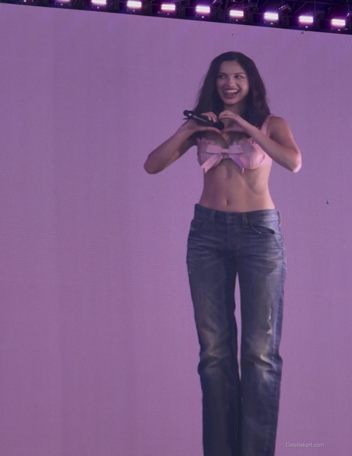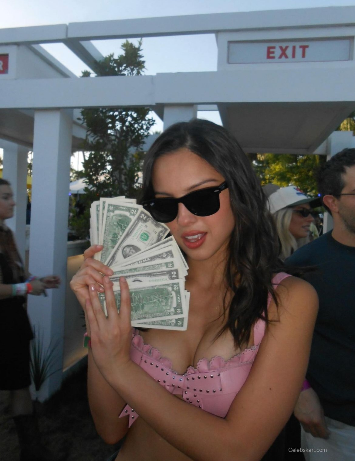 In her recent appearance, Olivia wore a striking pink top adorned with delicate lace detailing and small studs. The sleeveless design accentuated her figure while the bold color made her stand out in the crowd. Paired with denim shorts, her outfit was both casual and eye-catching, perfect for the lively atmosphere of the festival. Her choice to accessorize with sleek black sunglasses added a touch of glam, making her look .