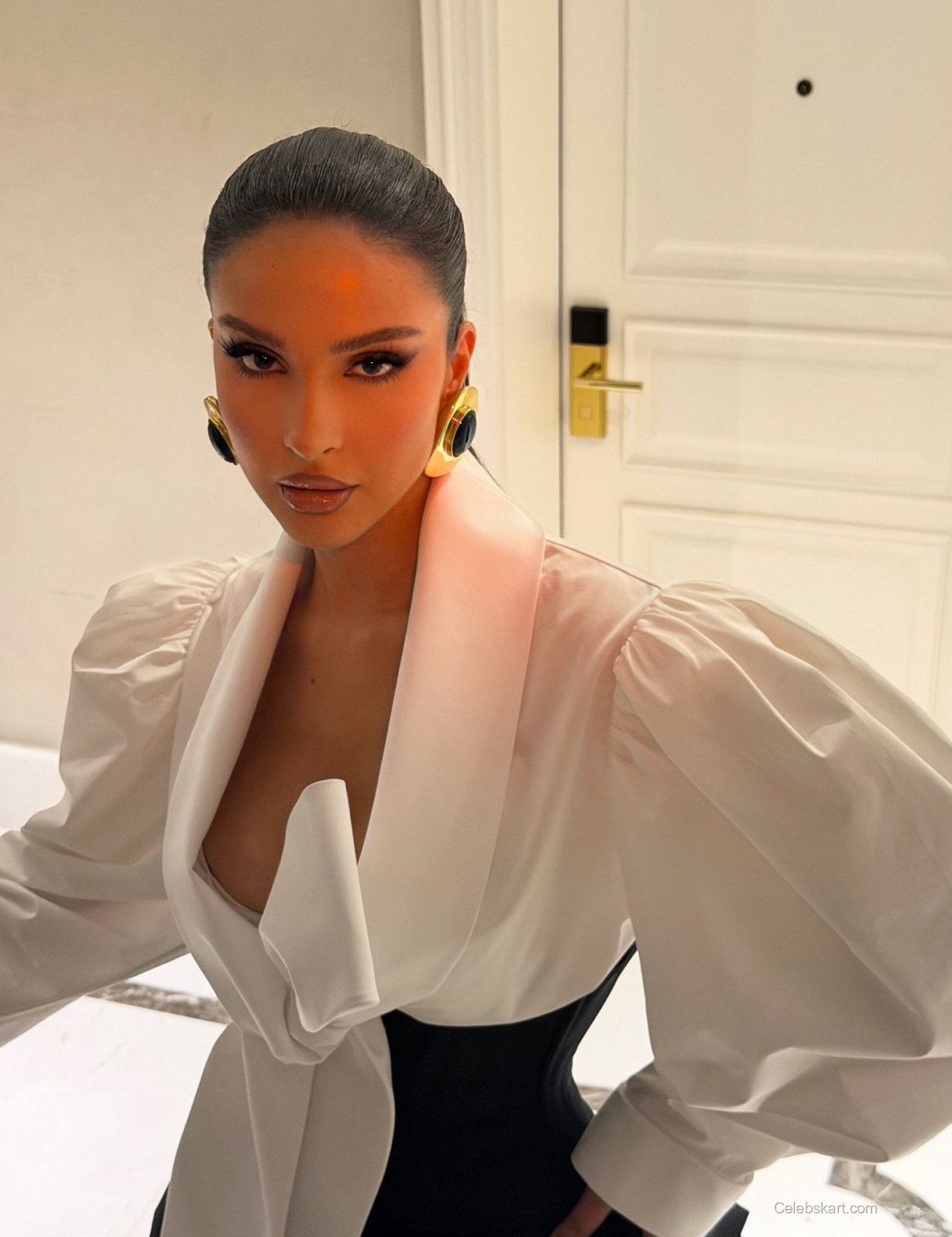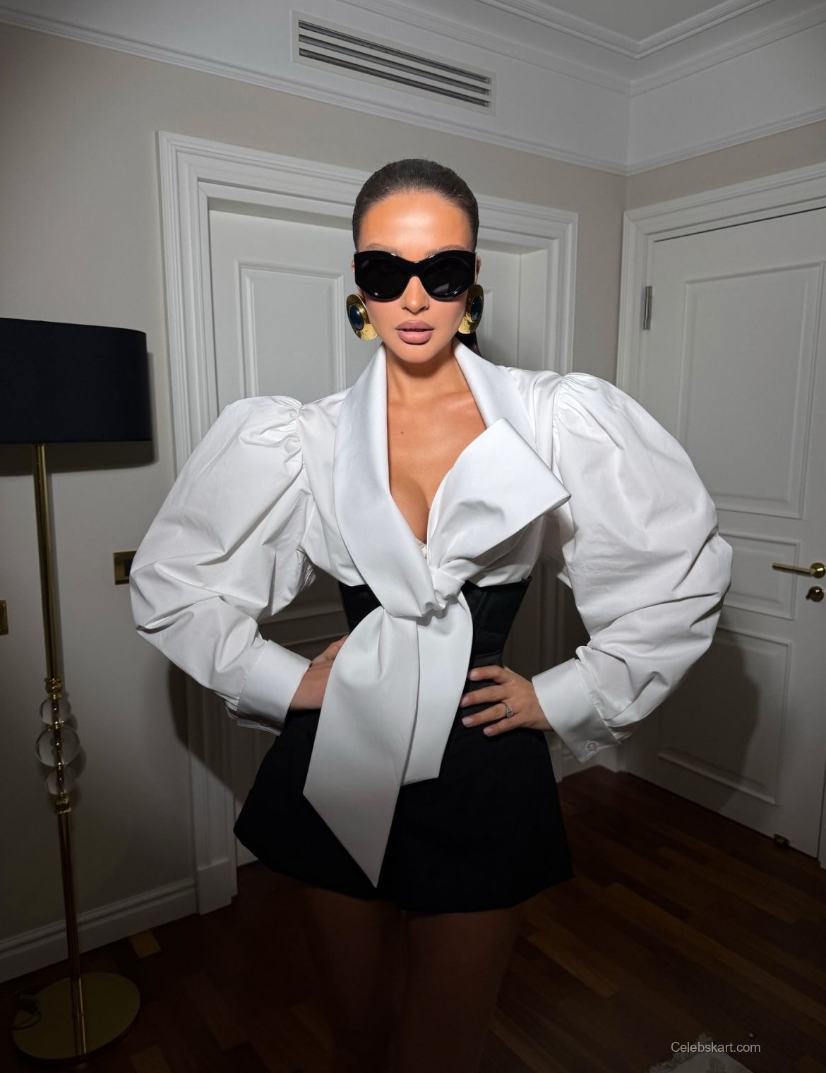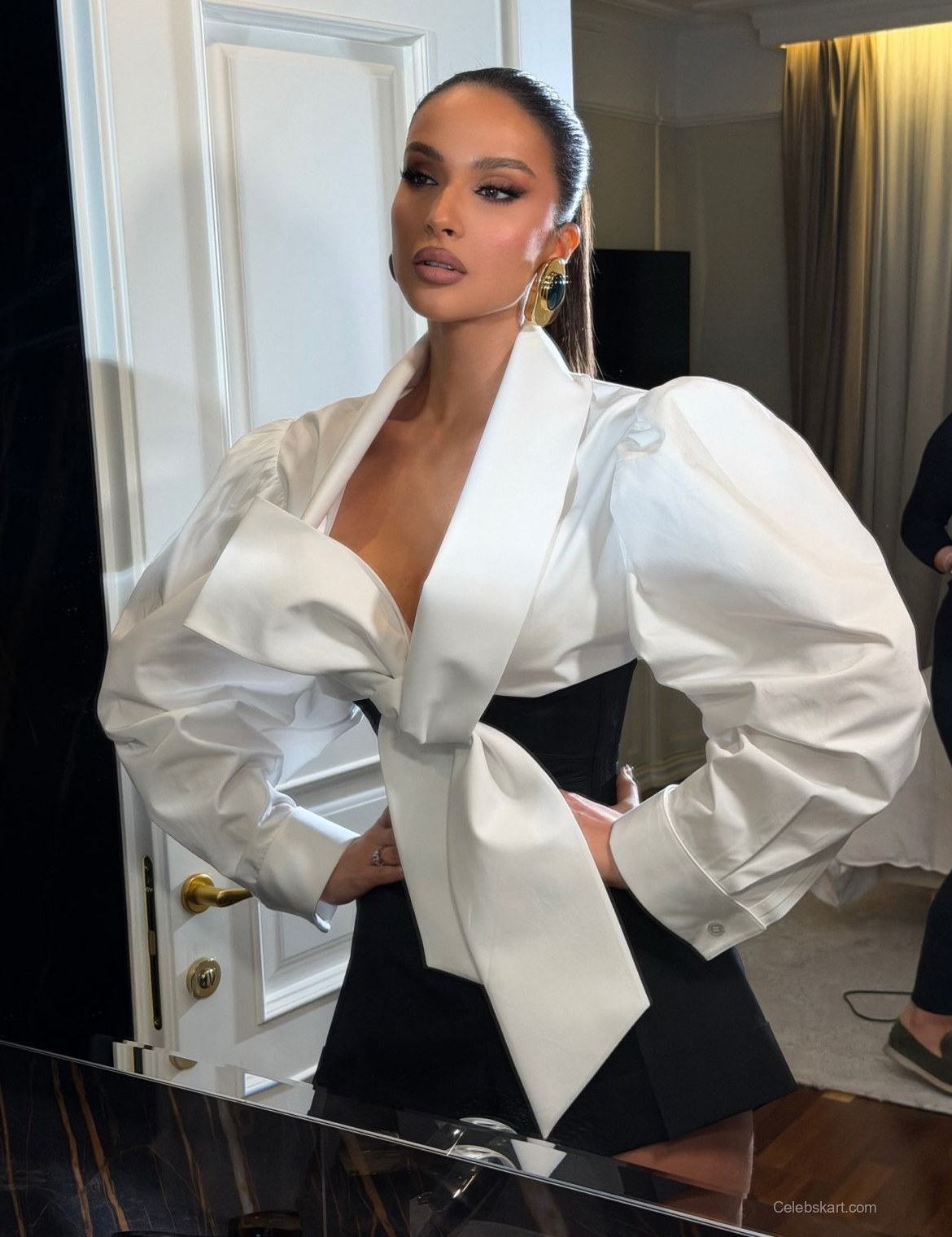 The outfit commanded attention with its *dramatic silhouette*. The standout white blouse featured oversized sleeves that added a sense of grandeur. The tie at the waist accentuated her figure, while the black shorts complemented the blouse, creating a striking contrast. Oriola also accessorized her look with *eye-catching statement earrings* and chic black heels, enhancing the overall visual appeal. Those interested in exploring more of Oriola's fashion may find her distinct style featured here.