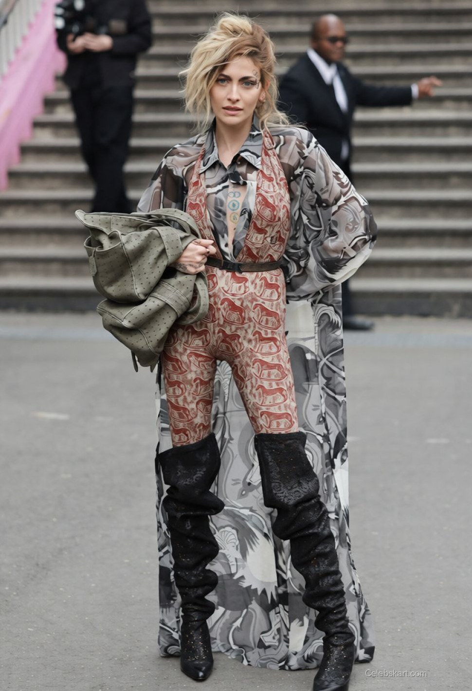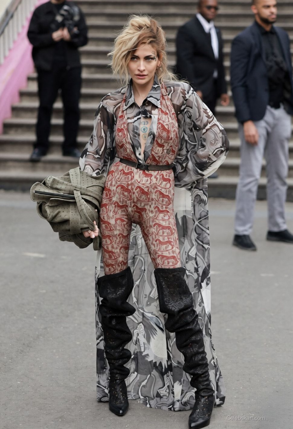 Her outfit featured a striking sheer top layered over a jumpsuit adorned with intricate prints and eye-catching tones. The combination of the red and gray hues made the ensemble pop, while the high-slit design added a daring touch. Complementing the outfit, Paris sported knee-high black boots that provided a fashionable edge. The outfit displayed her flair for mixing classic style with contemporary trends.