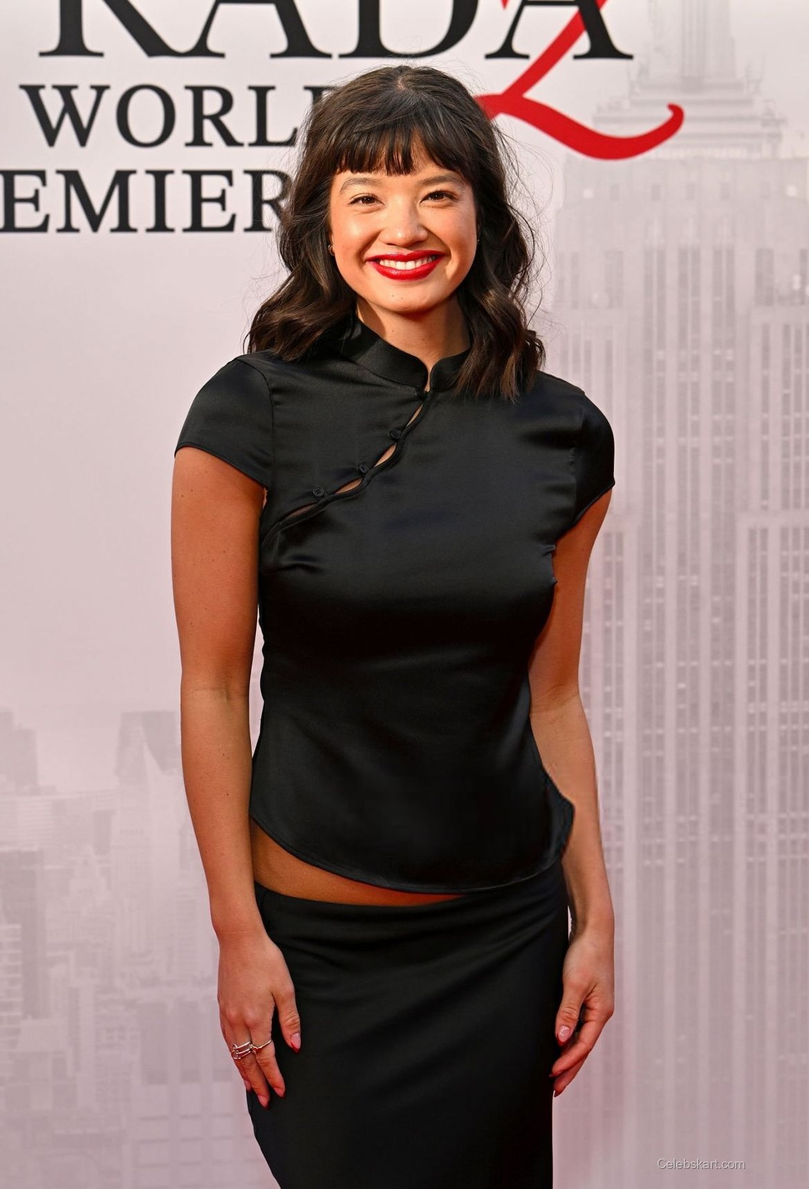 Lee radiated confidence as she posed for cameras, flashing a bright smile that showcased her signature red lipstick. Her hair, styled in loose waves, framed her face beautifully, enhancing her overall look. The setting was lively, with fans cheering in the background and the illustrious Empire State Building visible behind her. Lee’s joyful demeanor and engaging poses created a delightful atmosphere at the event, making it clear that she was enjoying every moment.