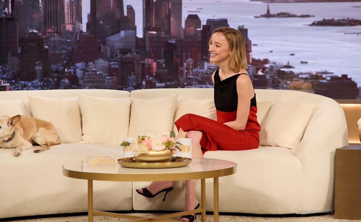 The color block dress was a masterclass in modern style, effortlessly combining sophistication with a playful edge. The fitted bodice accentuated Dynevor’s figure, while the red skirt flowed gracefully, adding movement that complemented her seated pose on the plush couch. She paired the look with stylish black heels that elongated her legs, providing a chic finish to her ensemble. This look is a perfect example of how color blocking can be both elegant and eye-catching, making it ideal for a daytime talk show appearance.