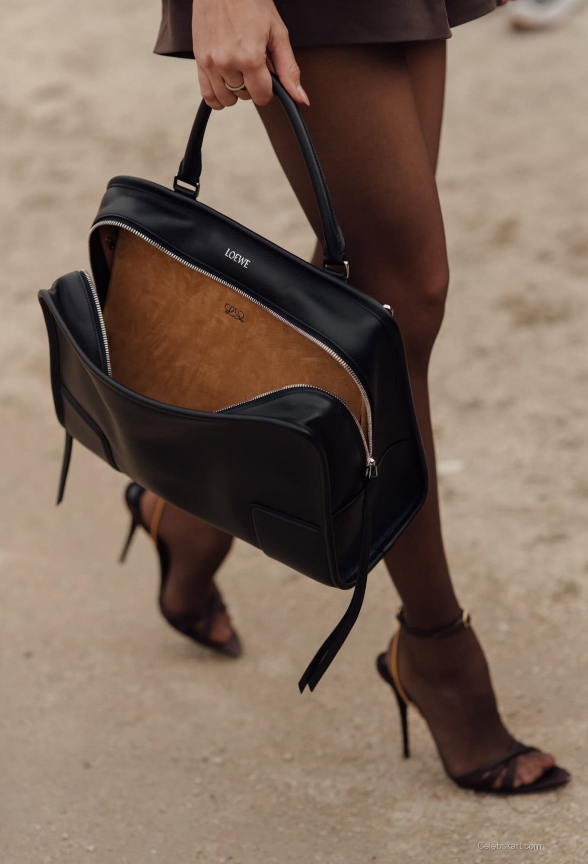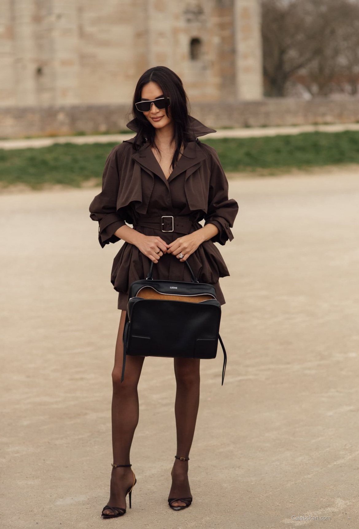 The key element of her look was a chic brown short dress with eye-catching puffed sleeves. This layered outfit was cinched at the waist, creating a beautiful hourglass shape. PIA paired this ensemble with sheer brown tights that added a touch of sophistication while accentuating her long legs. Completing the look were stylish black ankle-strap heels that provided a modern twist to the classic outfit. Her choice to carry a structured black bag added an unexpected yet fashionable contrast to the soft tones of her clothing.