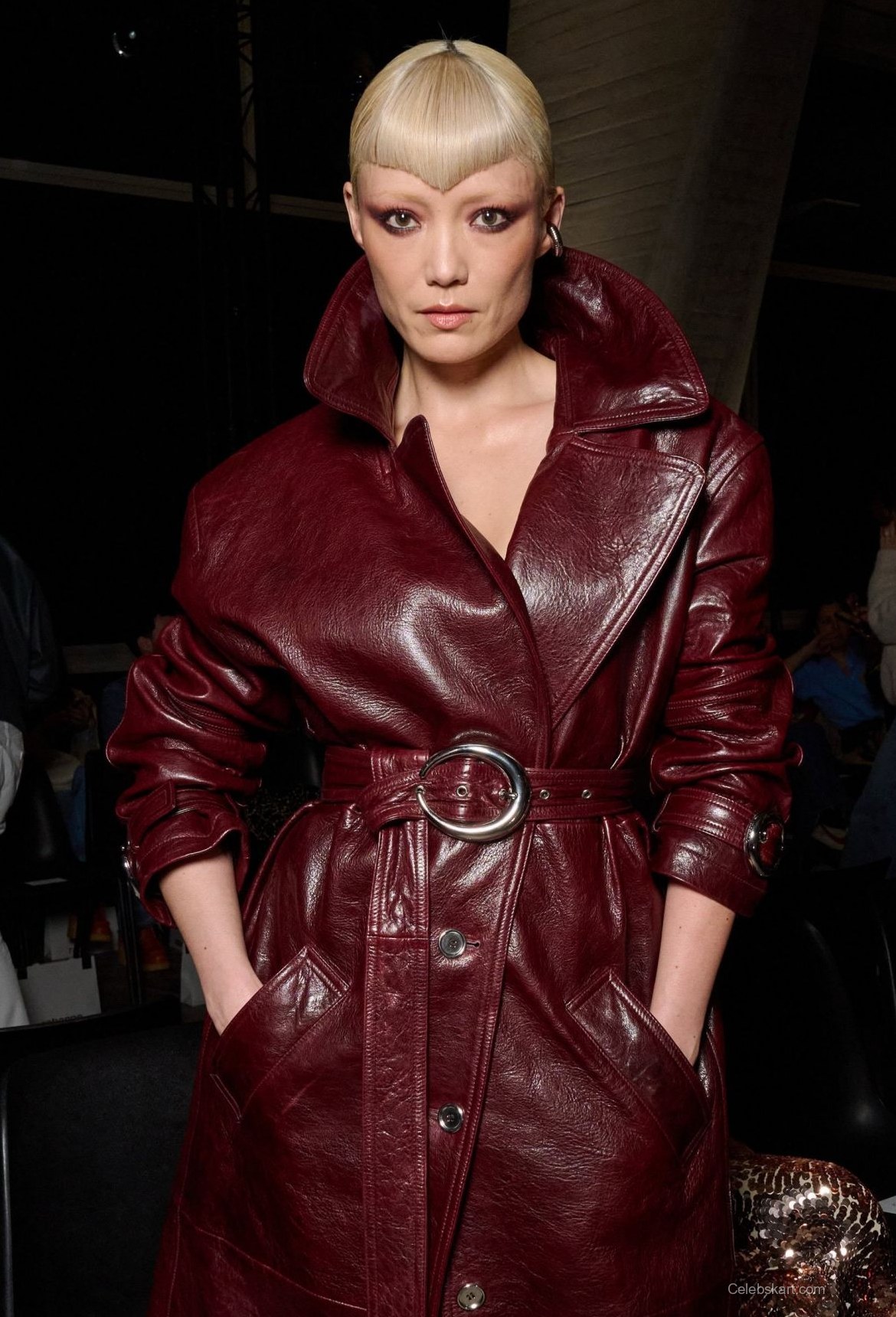 Pom’s outfit featured a long burgundy leather coat that cinches at the waist, accentuating her silhouette. The coat’s glossy finish gleamed under the lights, giving it an eye-catching appeal. Its oversized collar adds to the dramatic effect, making it a standout piece. With her hair styled in a sleek bob, she kept the focus on her ensemble, which included thigh-high stockings that enhanced the overall aesthetic.