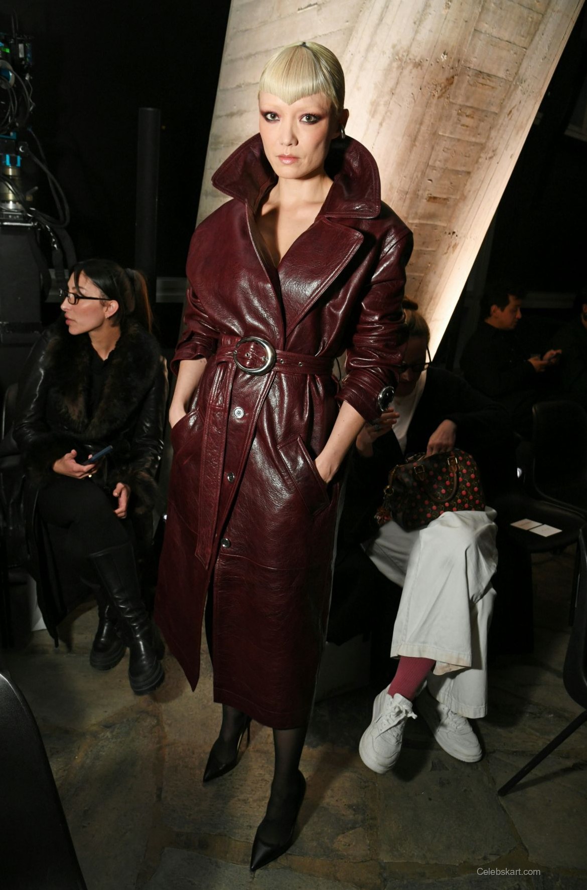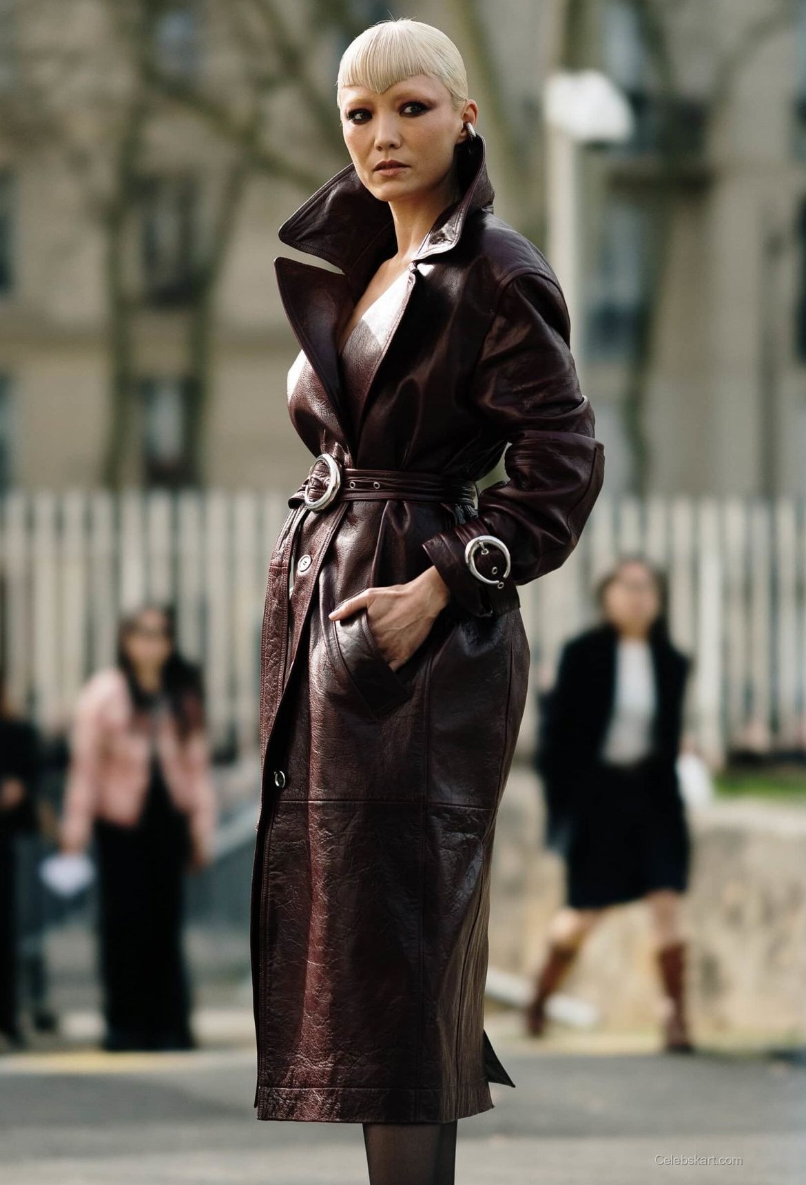 As Pom posed confidently, there was a palpable aura of poise around her. The event backdrop, bustling with fashion enthusiasts and photographers, created a lively atmosphere that perfectly matched her striking presence. With one hand in her coat pocket and a steady gaze, she reflected a blend of strength and elegance, fully embodying the spirit of the event.