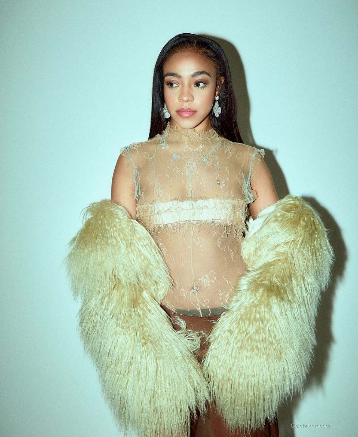 Priah's outfit is a stunning ensemble featuring a sheer lace top embellished with intricate details. The top is paired with a unique fluffy outerwear that adds an element of boldness to her look. Opting for a flowing skirt that gracefully extends to the floor, she effortlessly combines elegance and contemporary style. The soft pastel tones in her outfit complement her glowing complexion.