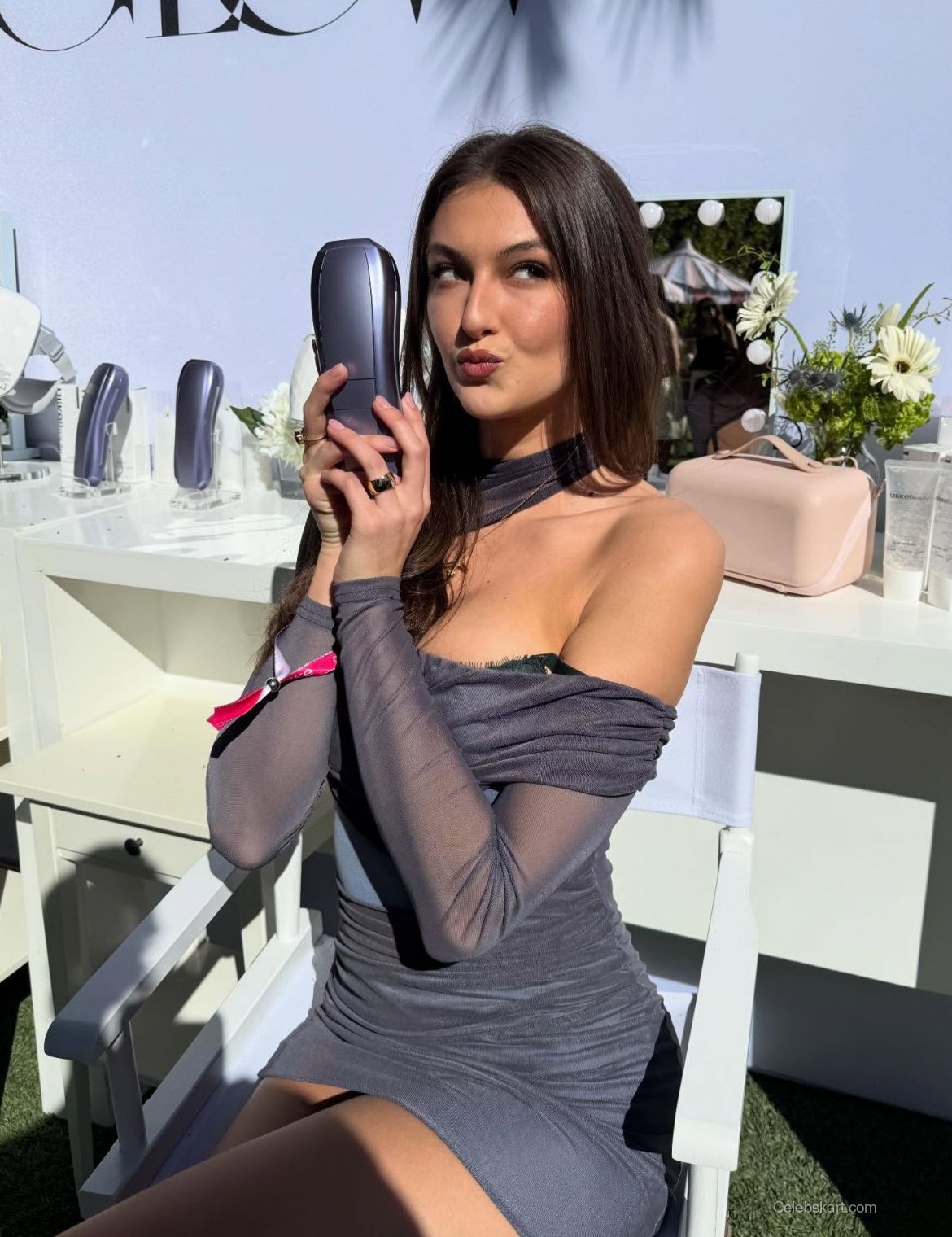 In one of her latest photos, Rachel dons a sleek gray mini dress that highlights her figure beautifully. The outfit features sheer sleeves, adding a touch of sophistication without losing its playful charm. She pairs this look with knee-high black boots, which add an edgy flair to her overall appearance. The vibrant red pillow she holds contrasts perfectly with her dress, creating a striking visual.
