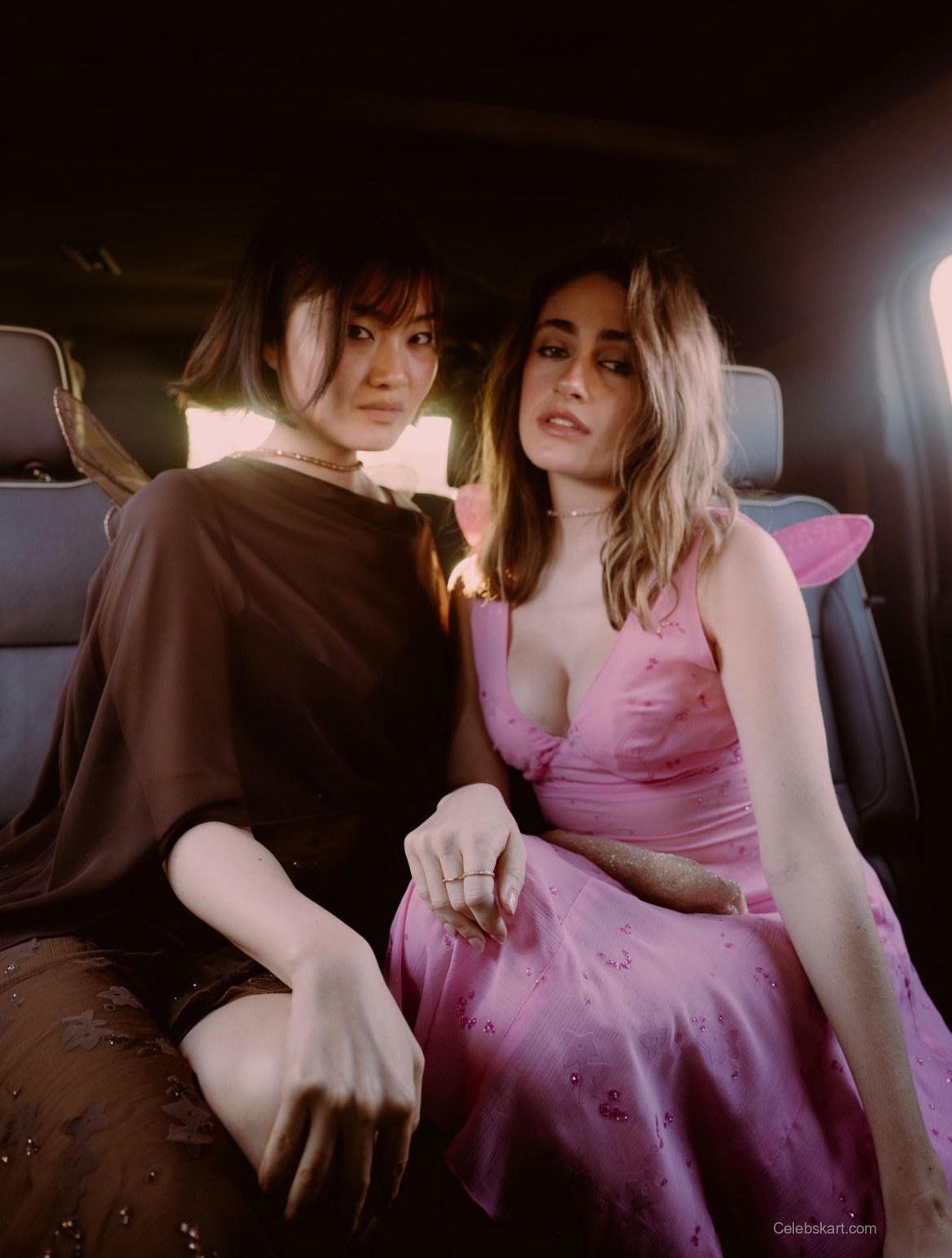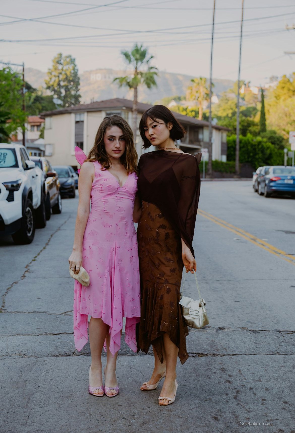 Posing with confidence, Sennott was captured conversing with fellow attendees, showcasing a dynamic presence at the premiere. Her casual interactions, mixed with thoughtful moments of reflection, demonstrated her comfort and excitement in the spotlight. The backdrop of the bustling event, paired with the sun’s glow, enhanced the ethereal quality of her outfit.