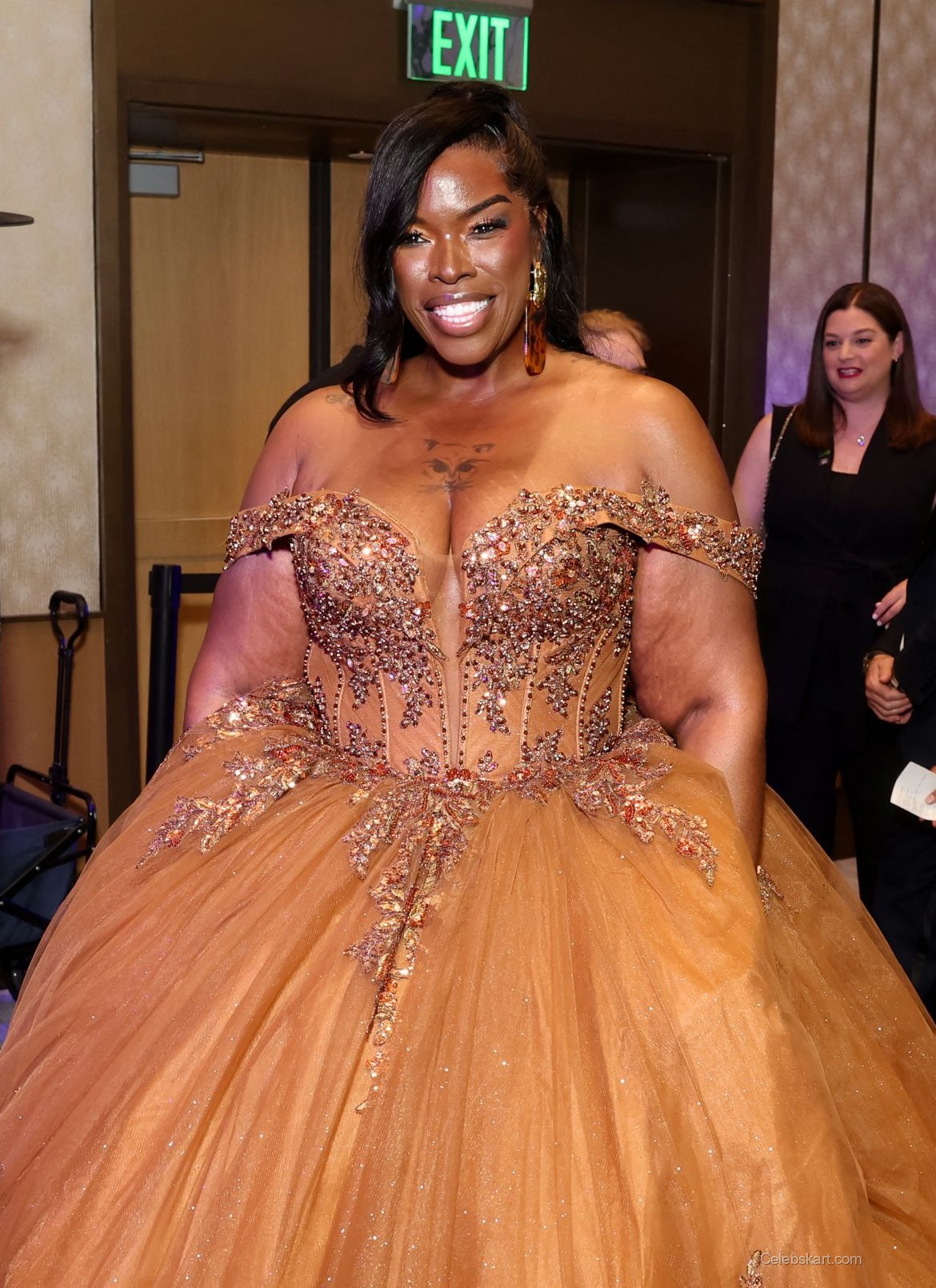 This look stands out not just for its striking color and design but also for the way Raeshanda carries it with grace. The combination of the amber hue and the ornate embellishments showcases her personal style while highlighting her confidence. The gown’s fit and flow allowed her to move freely, making it an ideal choice for an event centered on celebration and advocacy.