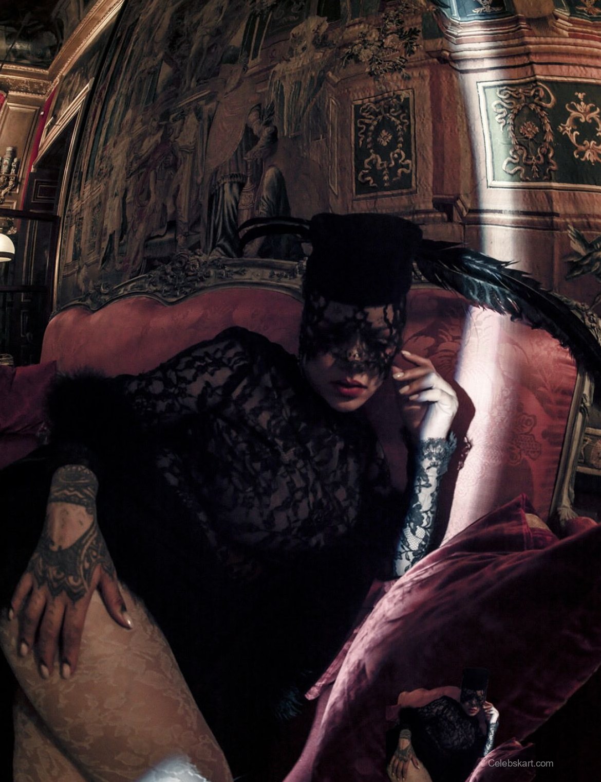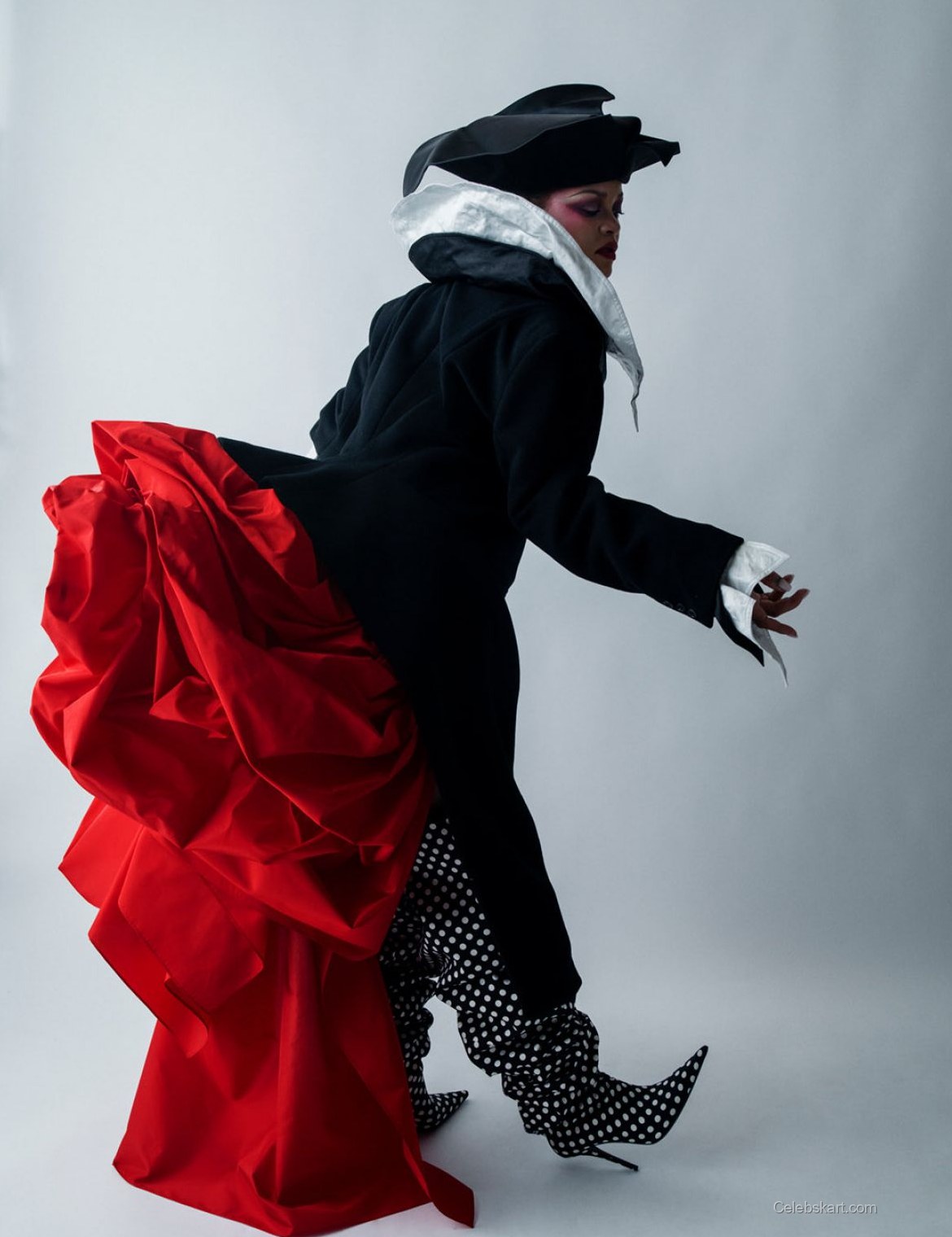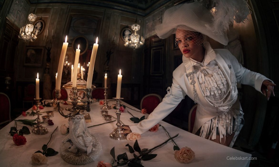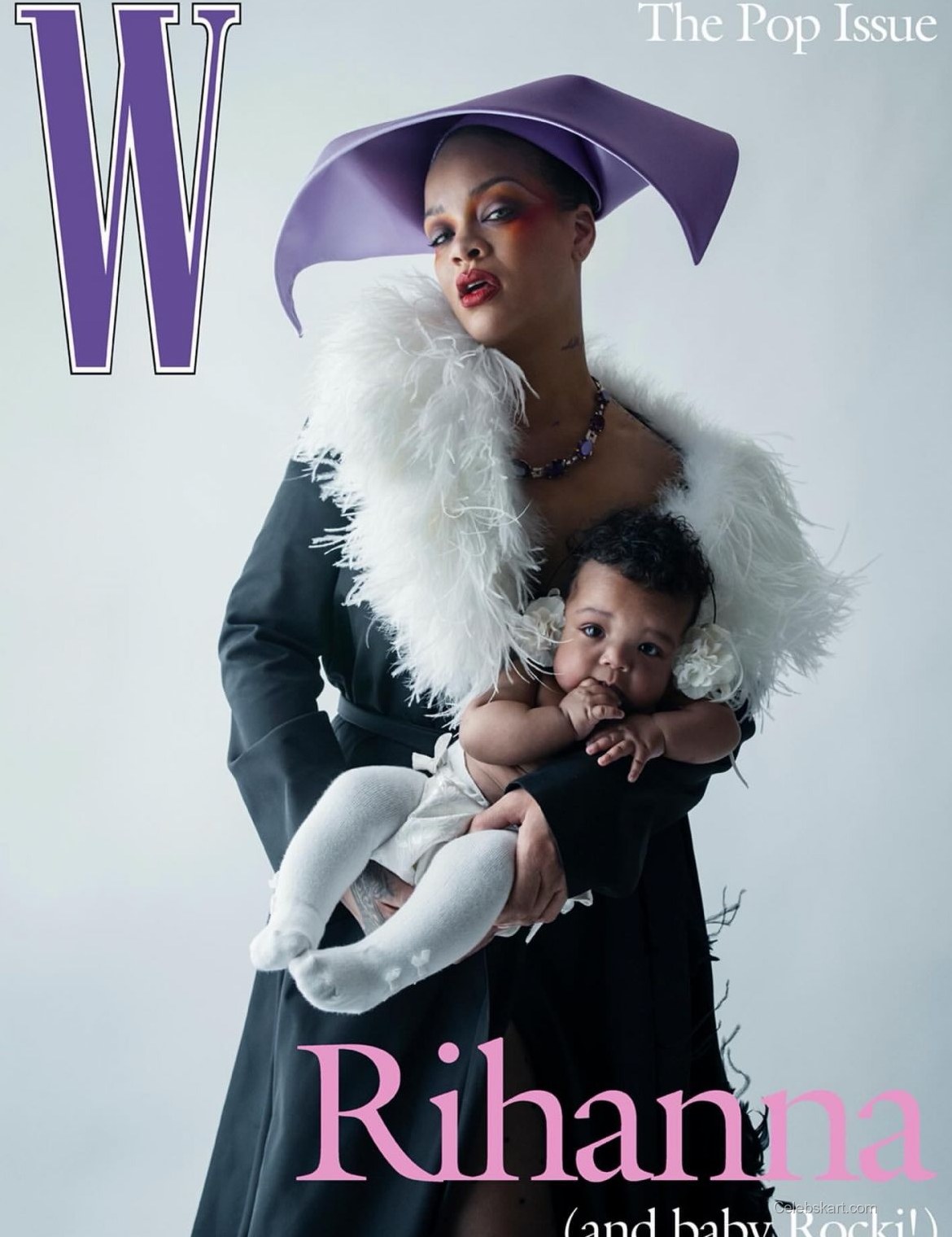 Rihanna is featured in the W Magazine Pop Issue for 2026. She wears a dramatic black outfit with white feather accents. The striking purple hat adds a bold statement to her look. Rihanna holds her baby, Rocki, in her arms. The outfit consists of a fitted black coat paired with a layered design. Her nails are painted in an eye-catching dark color. The overall look creates a memorable presence on the cover.