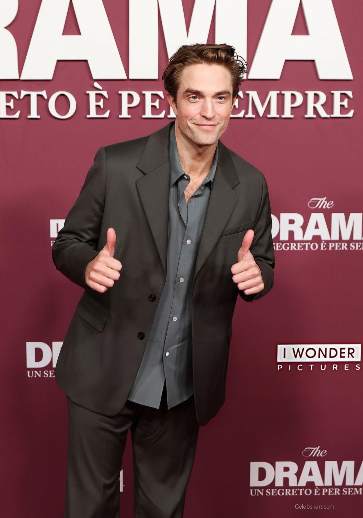 Sporting a confident stance, Pattinson posed for cameras with a friendly demeanor. At one moment, he extended both thumbs up, signaling his excitement about the film. The red backdrop featuring the film title set a vibrant tone, contrasting beautifully with his outfit. The lighting enhanced his features, giving off an inviting aura as he interacted with fans and reporters alike.