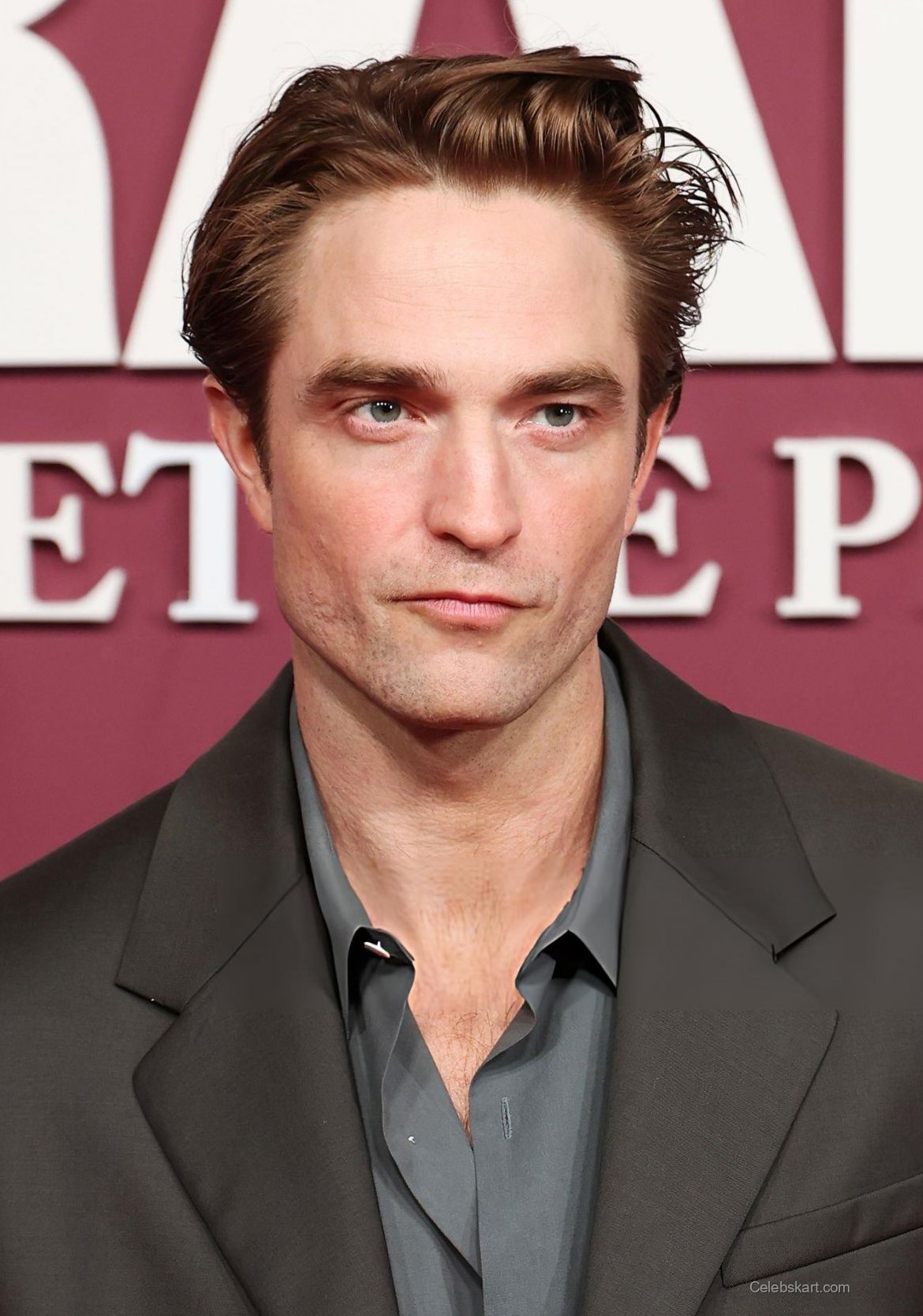 Robert Pattinson opted for a darkly tailored suit complemented by a soft, light blue shirt. The jacket's subtle sheen paired effortlessly with the relaxed fit of the shirt, creating a chic silhouette. Pattinson's choice of footwear— smart black shoes—added to the overall polished look, making him stand out on the red carpet.