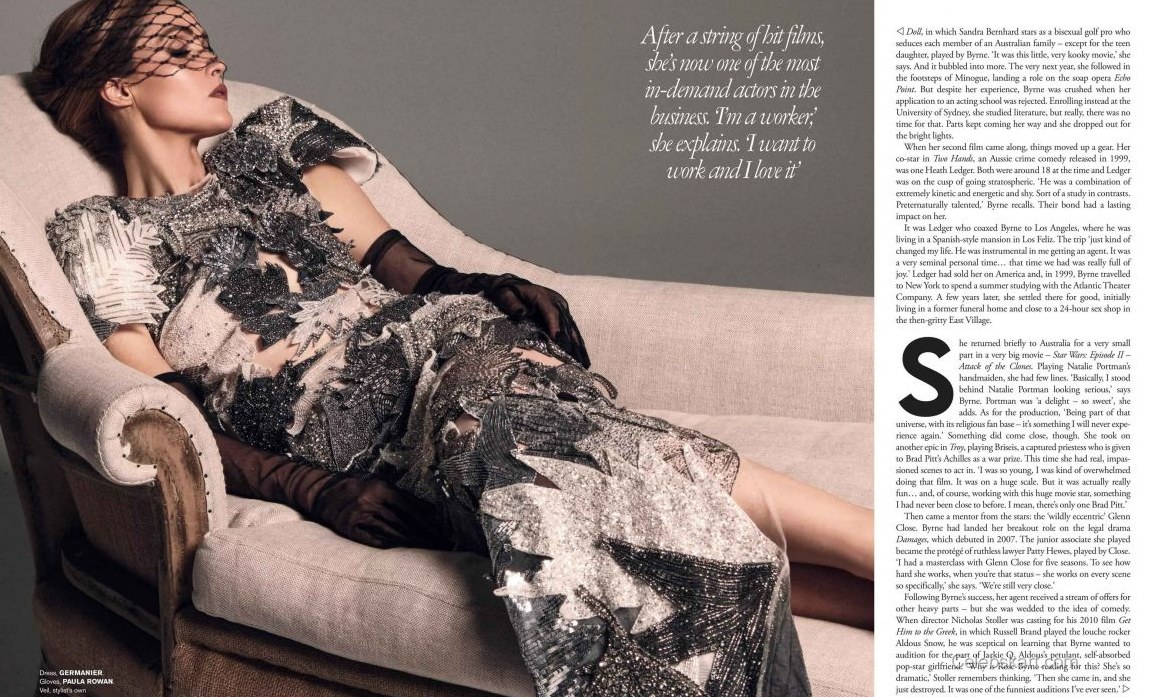 In the magazine, Rose Byrne is seen wearing a beautiful Chanel gown. The dress features a sleek silhouette with a delicate off-shoulder design, beautifully draping down to the floor. Its soft, creamy color enhances her complexion, making it a standout choice. The striking design of this gown effortlessly showcases her refined taste. You can find similar pieces when exploring fashion trends inspired by Rose Byrne.