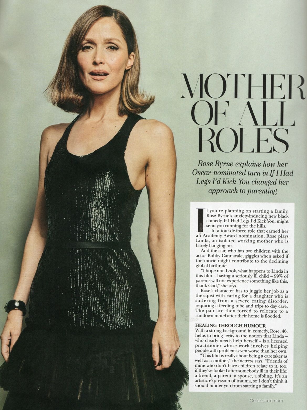 Rose's dress features shimmering black sequins that catch the light beautifully. The sleeveless design accentuates her shoulders and adds a touch of playful drama to her ensemble. A fitted belt cinches at the waist, creating a flattering silhouette. Her overall aesthetic is both polished and contemporary, making it a highlight of contemporary fashion in the magazine. For more on Rose Byrne's fashion choices, check this out.