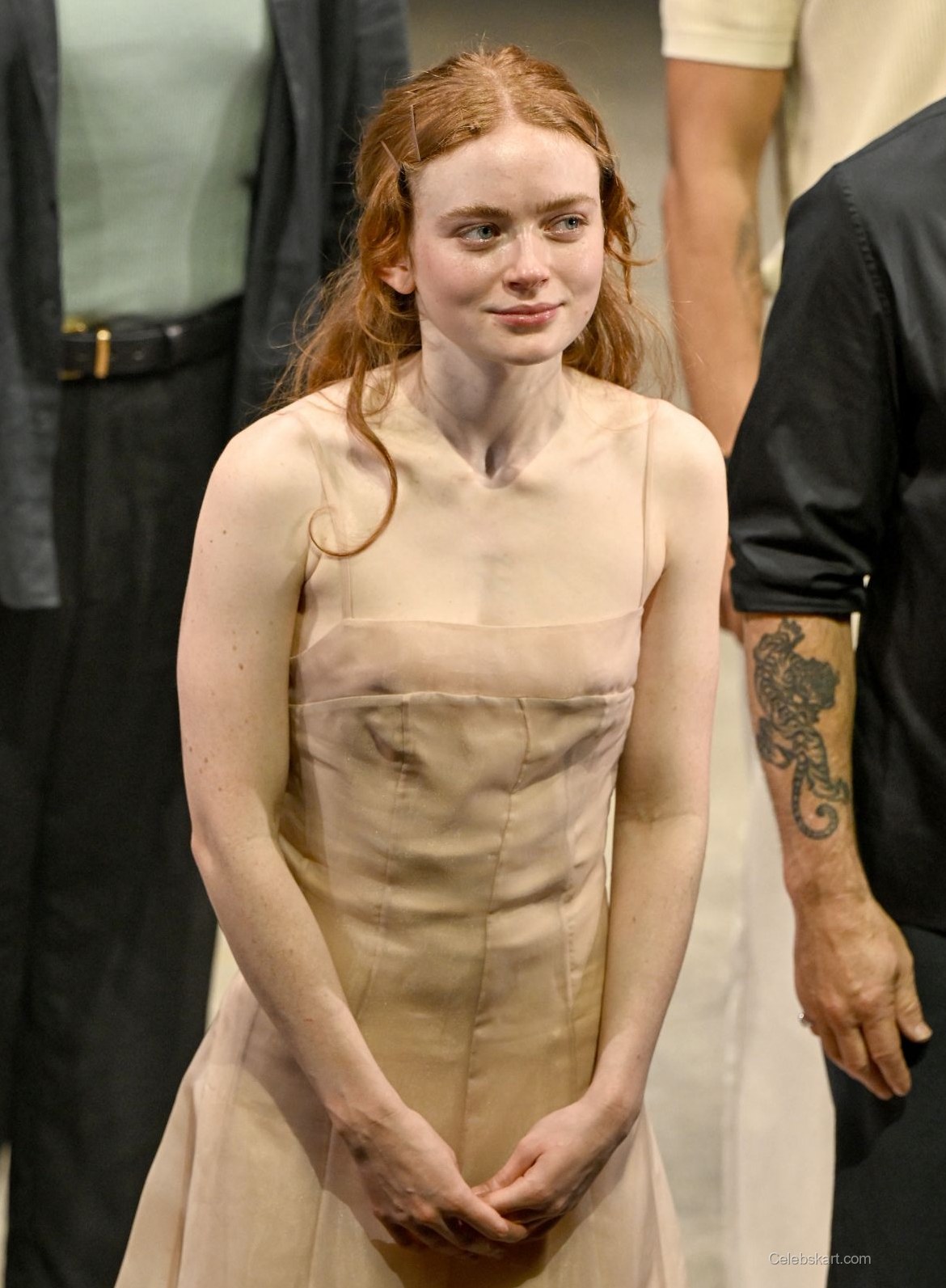 The standout element of Sadie Sink's outfit was her delicate nude gown. The dress featured a fitted bodice that gracefully flowed into a soft, ethereal skirt, which seemed to capture the light beautifully. The simplicity of the gown emphasized Sadie’s natural beauty, allowing her to shine without overwhelming embellishments. The soft color palette complemented her striking red hair, creating a harmonious balance in her appearance.