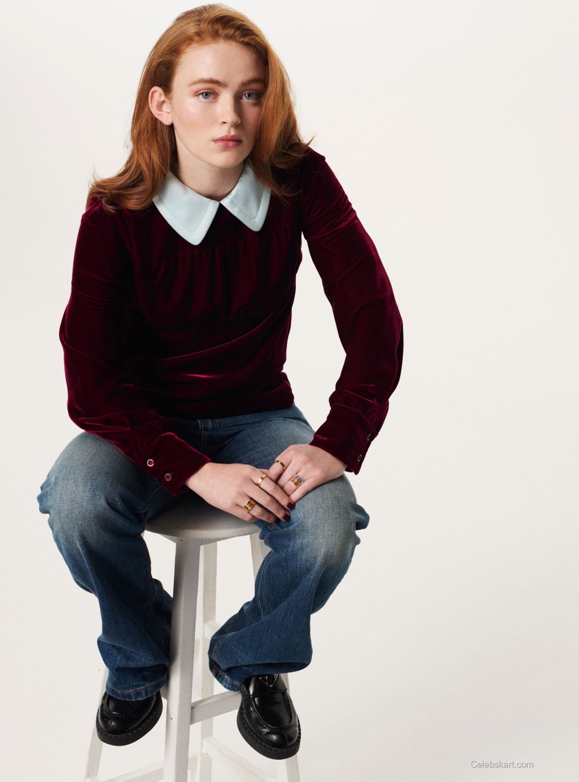 The outfit features a plush burgundy top with a distinct white collar that adds a pop of freshness to the deep color. The top is styled with long sleeves, enhancing its sophisticated appeal. Paired with light blue jeans that have a relaxed fit, the overall look exudes a blend of casual and chic. Completing the outfit, Sadie wears black loafers, grounding the look in a fashionable yet comfortable way.