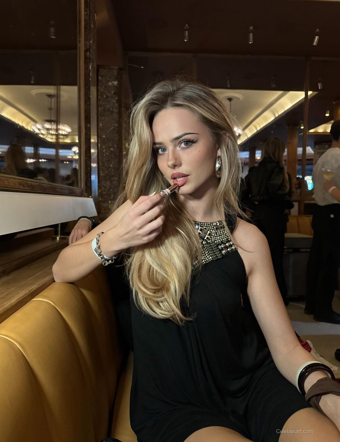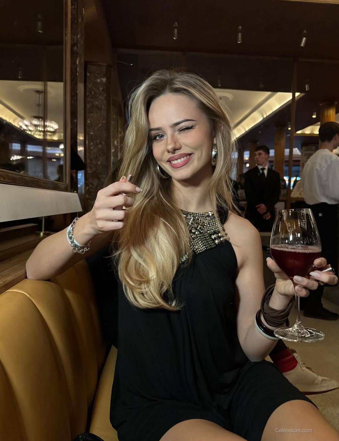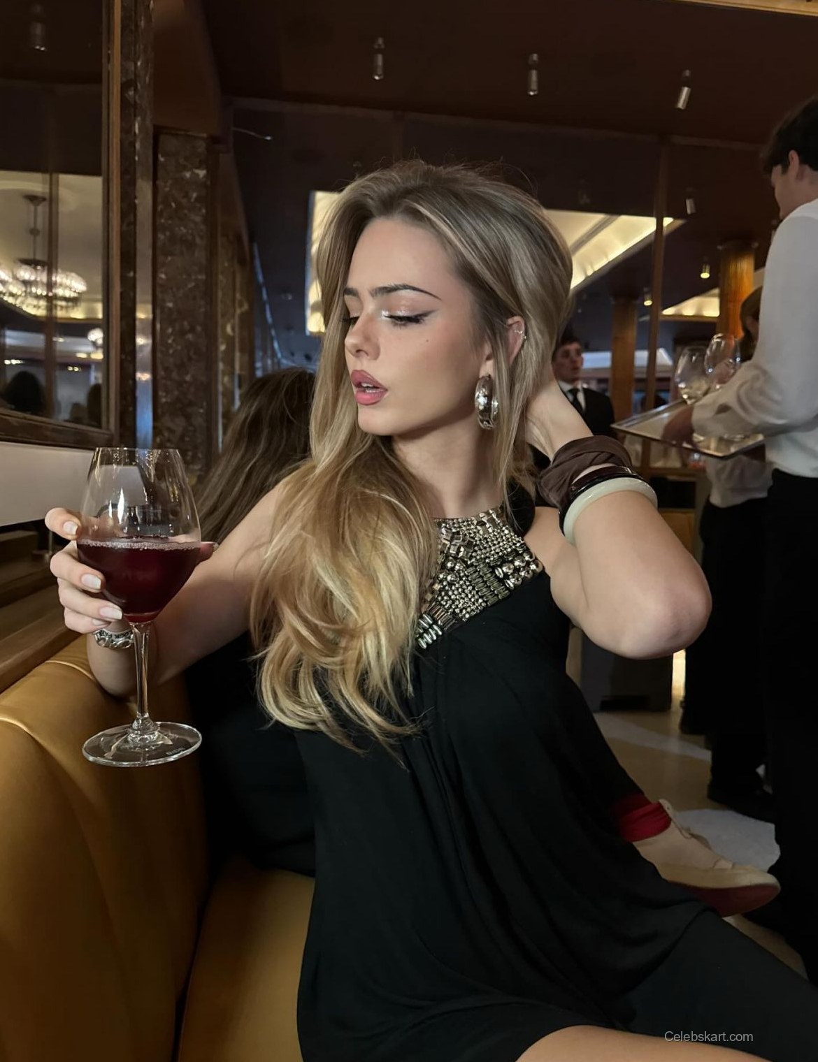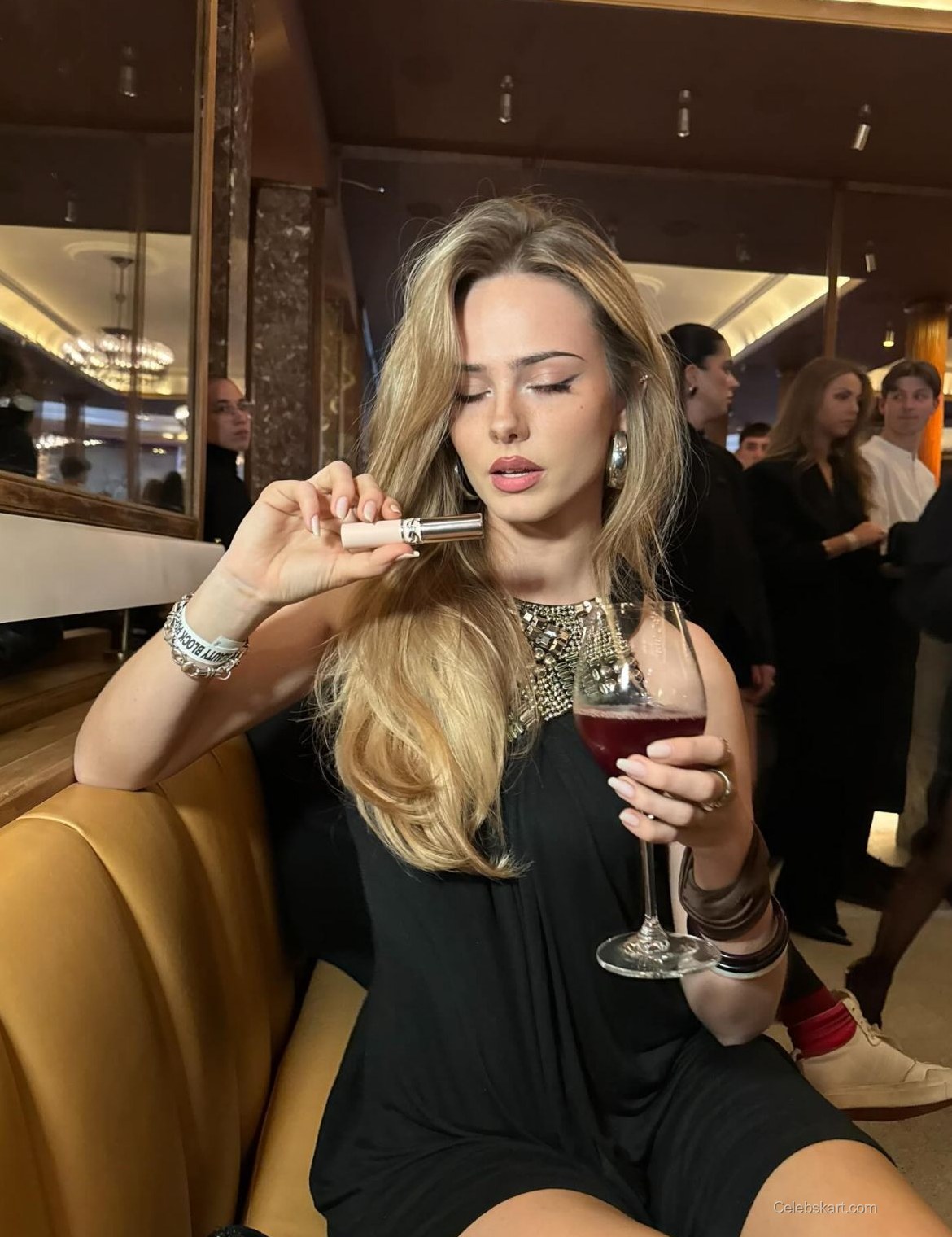 As Sara enjoys her drink, she creates an effortless yet captivating mood. With her flowing hair framing her face, she appears relaxed and engaging. Whether holding the glass or adjusting her hair, her movements resonate with a sense of fashionable grace. The ambient lighting in the background accentuates this look, making her stand out among the gala attendees.