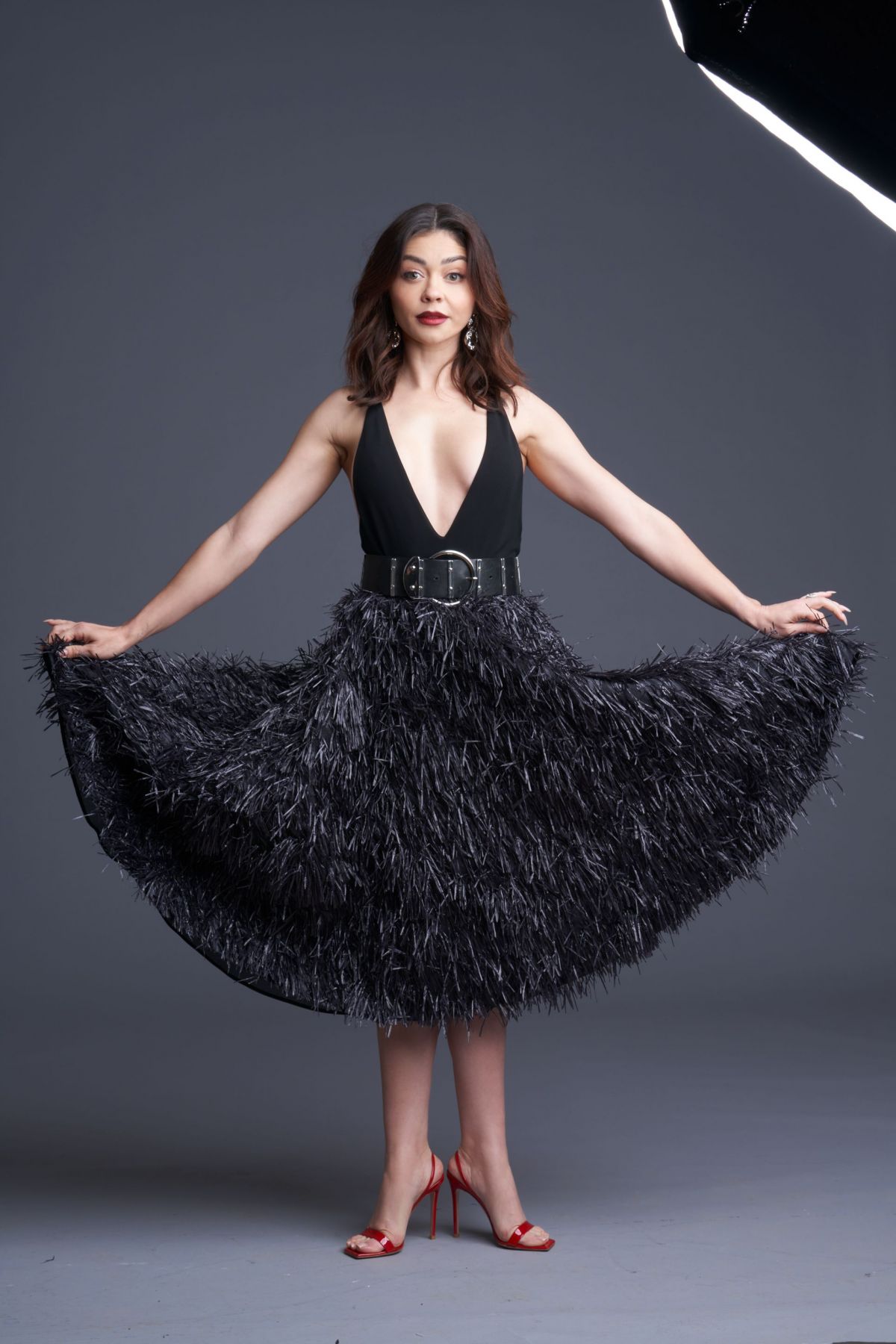In one of the standout shots, Sarah wears a structured black bodysuit paired with dramatic lighting and a confident pose, highlighting both her fashion sense and on-camera intensity. Other images in the series feature sleek hairstyles, dark-toned makeup, and editorial styling that adds a bold, modern flair to the shoot.