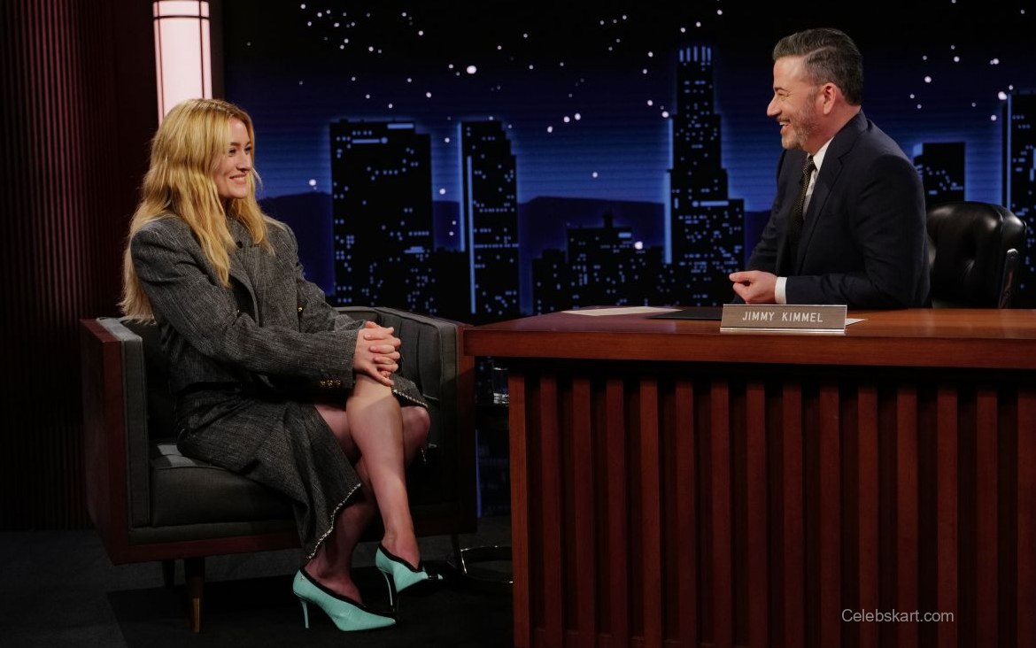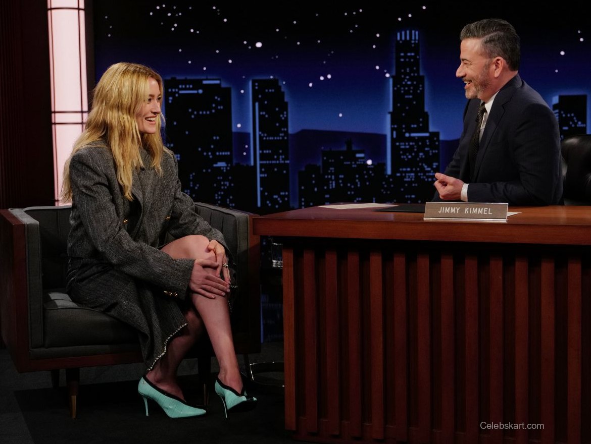Throughout the appearance, Sarah Pidgeon exuded confidence. Her long, wavy hair framed her face beautifully, enhancing her vibrant smile. Sitting comfortably on the Jimmy Kimmel Live! set, she interacted with the host effortlessly, gesturing animatedly and laughing, which created a welcoming atmosphere. The combination of her outfit and demeanor captured the essence of the evening perfectly.